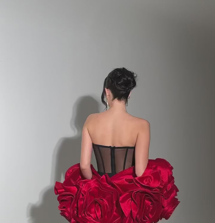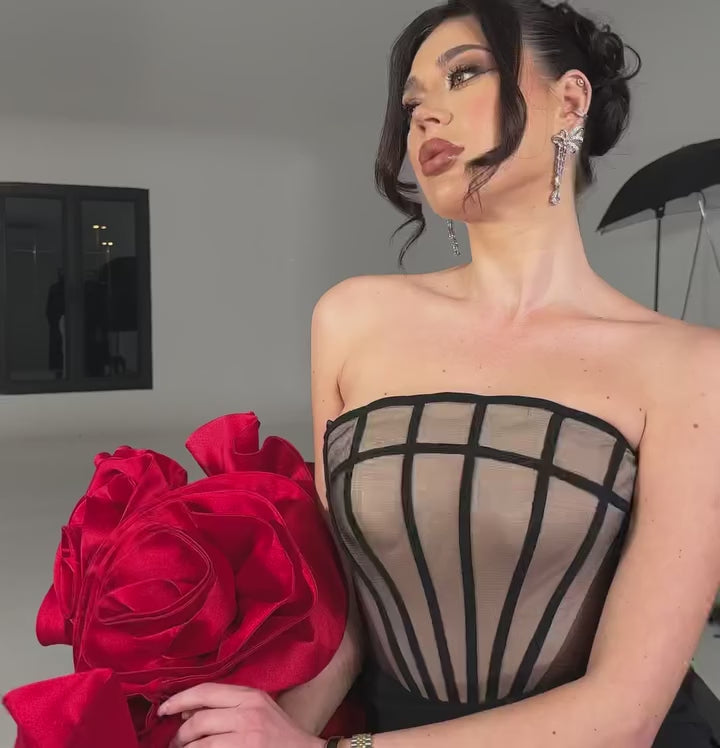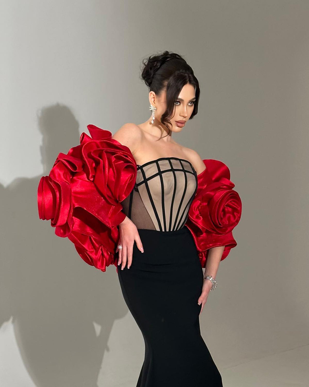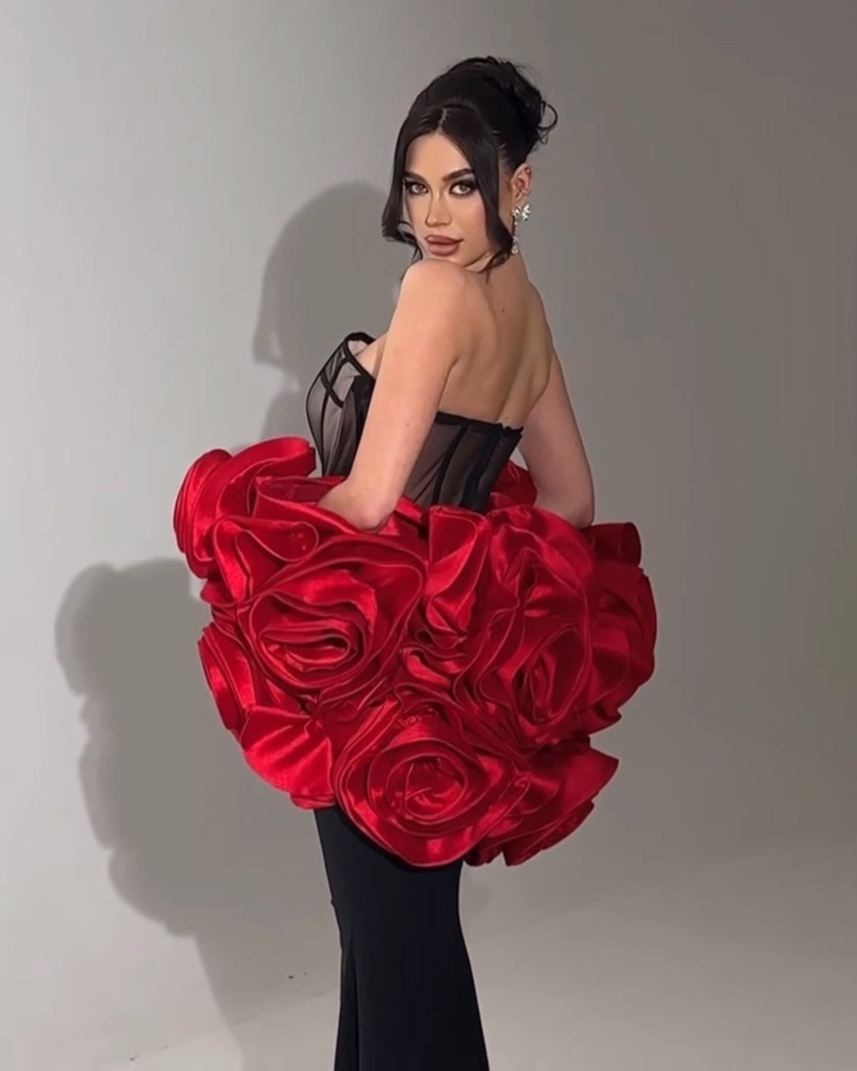 This elegant evening dress features a unique 3D floral design that adds a touch of glamour and sophistication. The mermaid silhouette flatters the figure and the black color adds a timeless and classic look. Perfect for any formal event or special occasion.