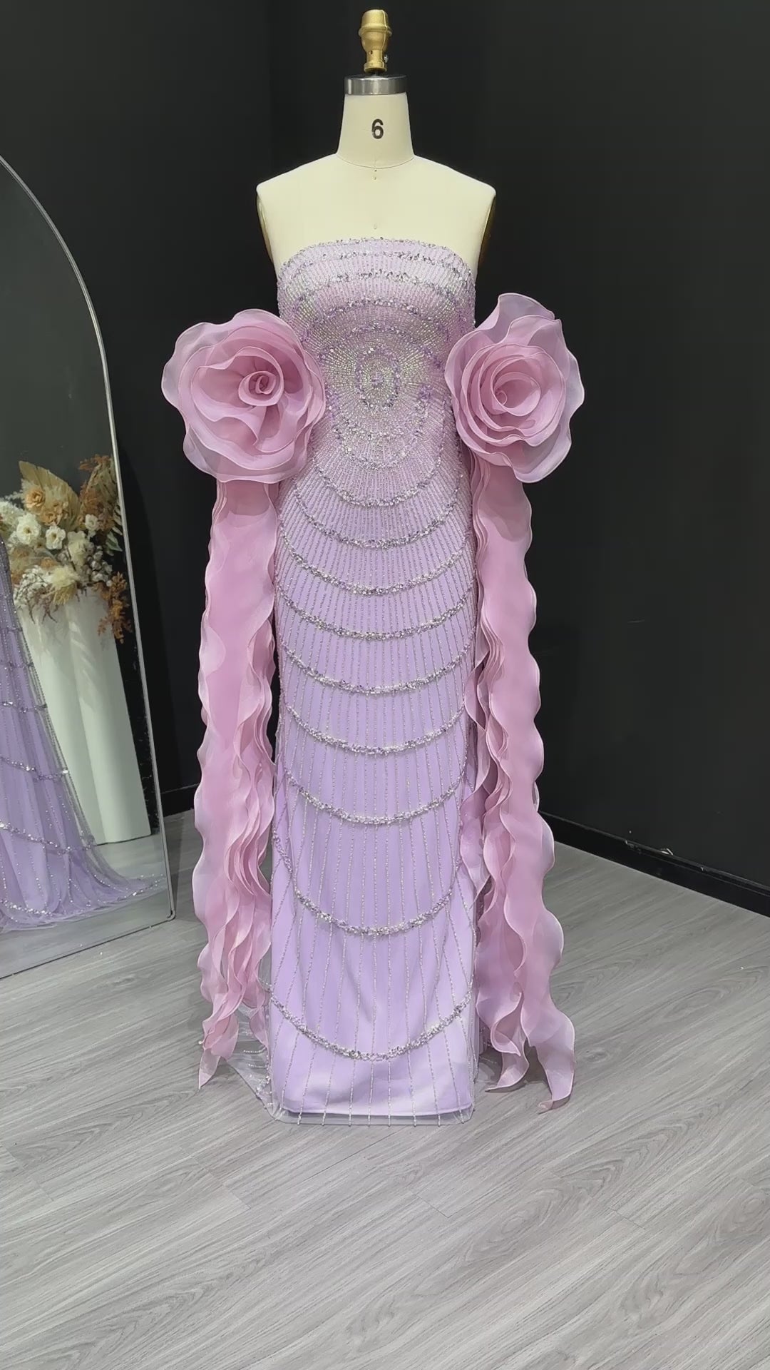 This stunning evening dress features intricate 3D floral details in a beautiful lilac hue. Adorned with delicate beads, it exudes elegance and glamour. Perfect for a special occasion, this dress will make you feel confident and sophisticated.