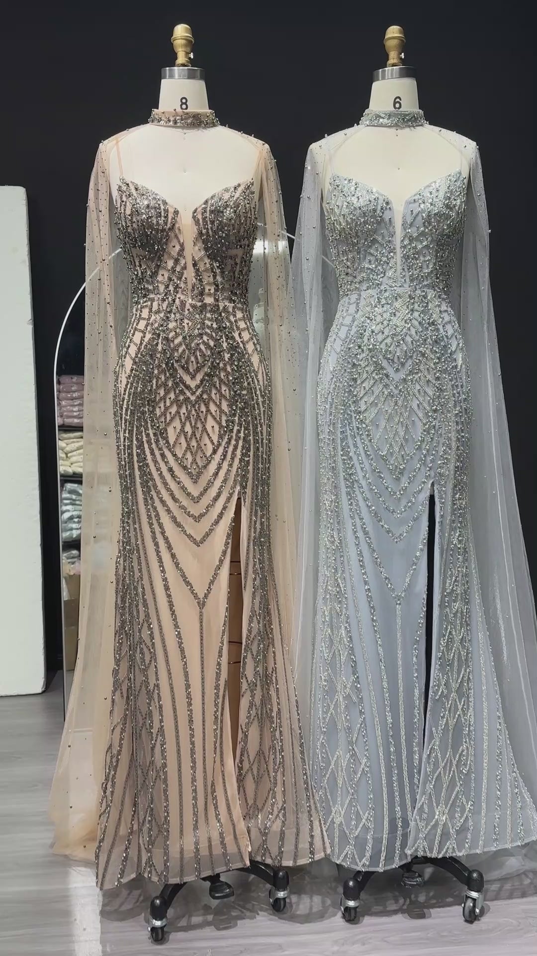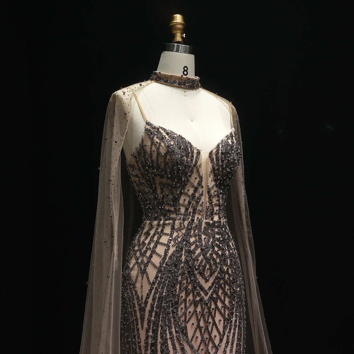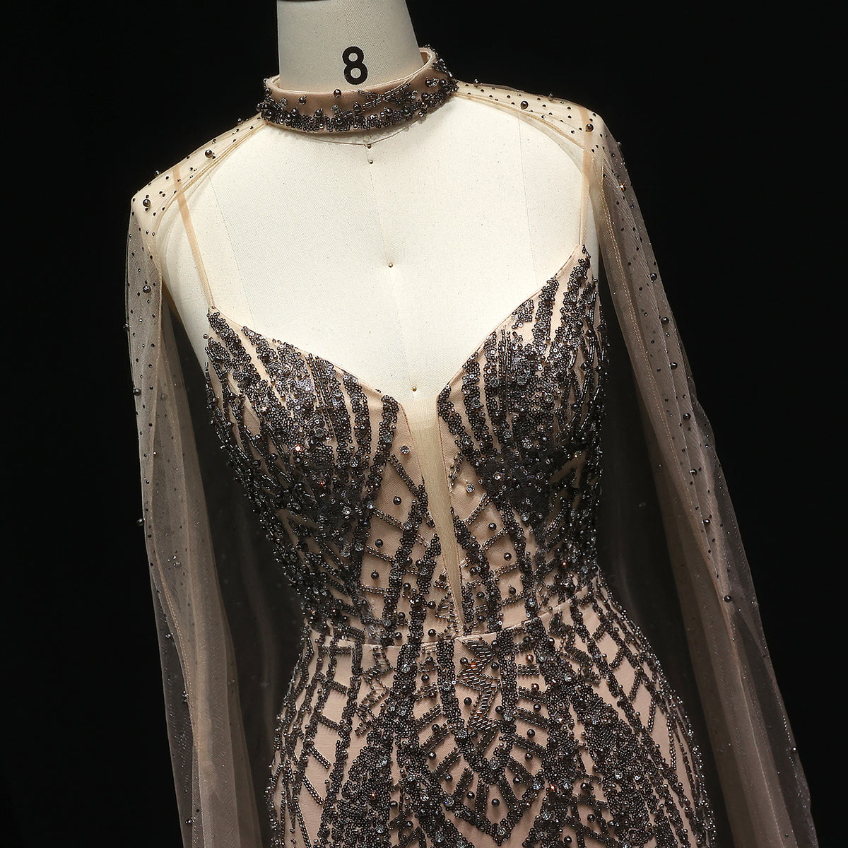 Glamorous Beaded Brown Memaid Evening Gown with Cape SS055