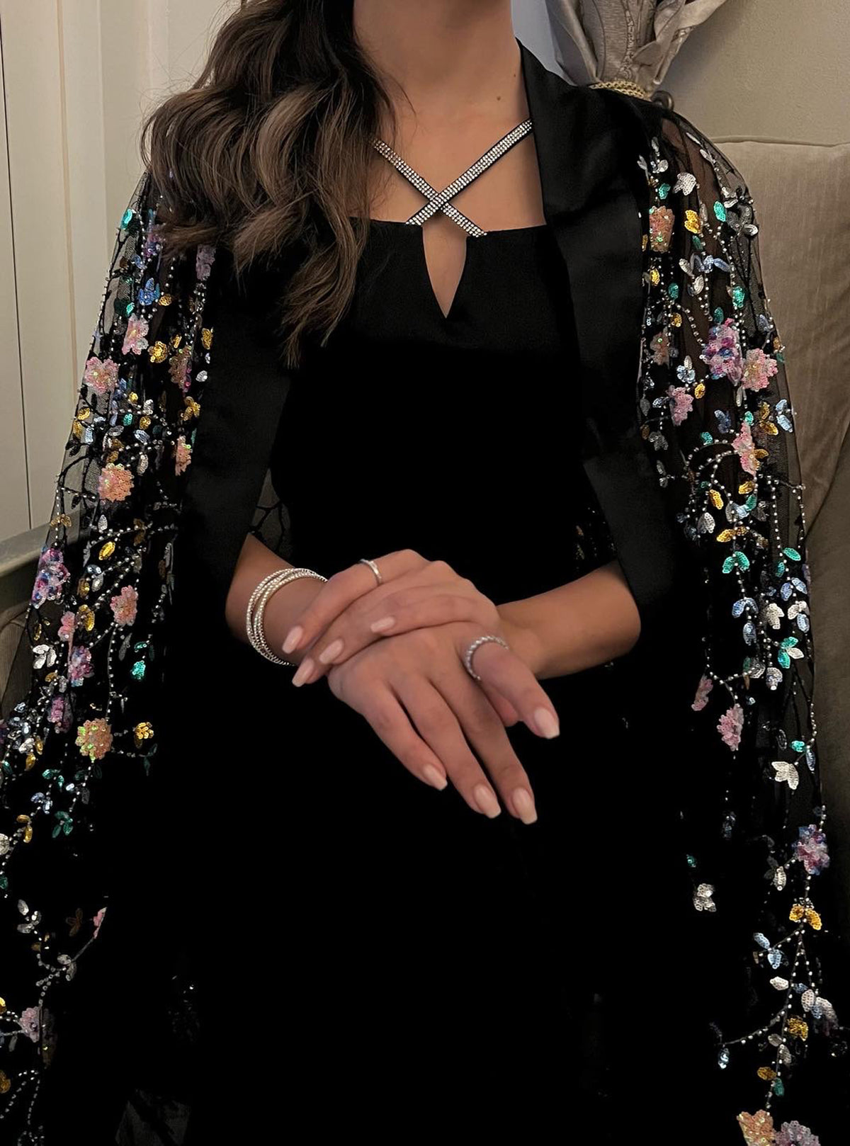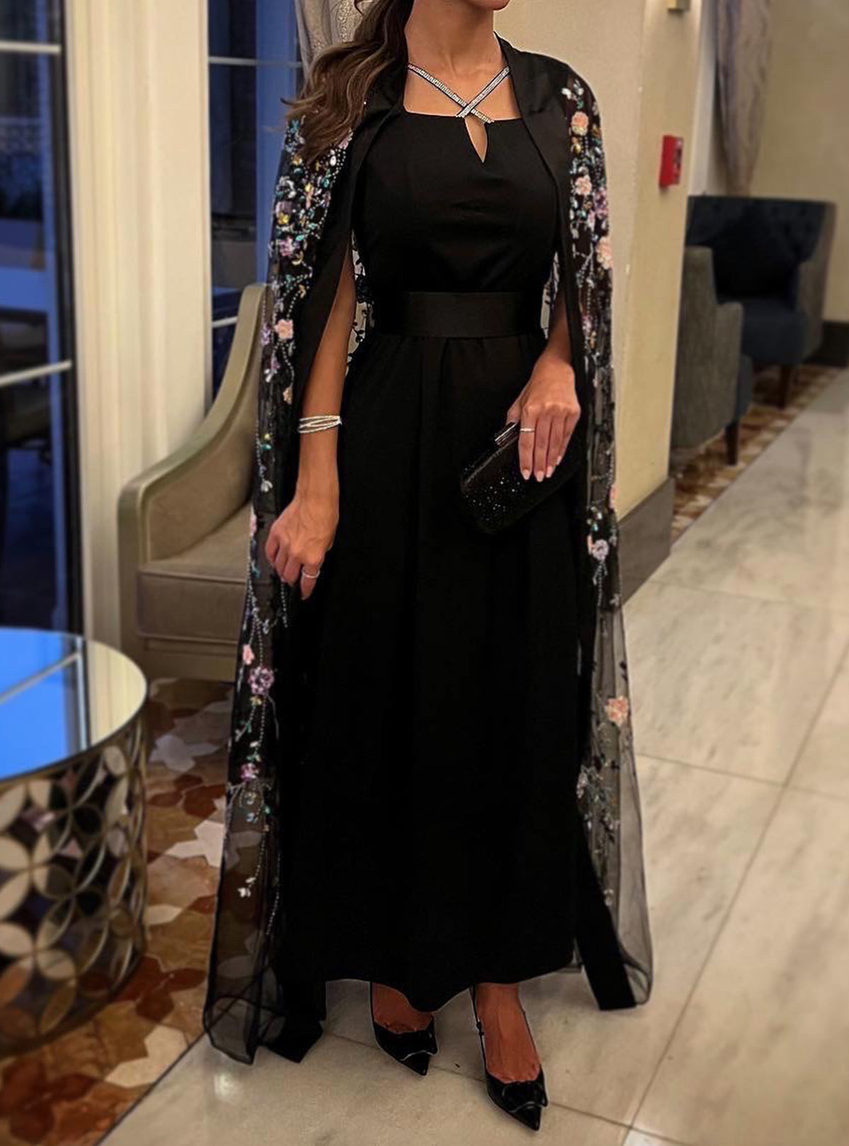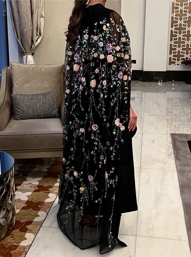 Luxury 3D Floral Black Evening Dress with Cape SF426