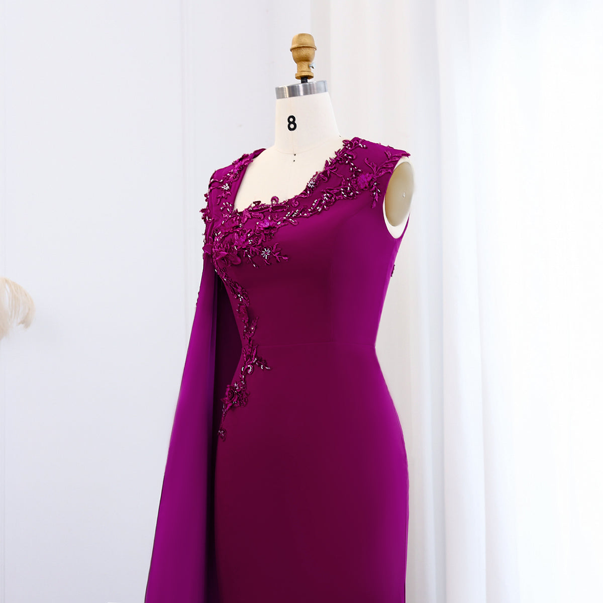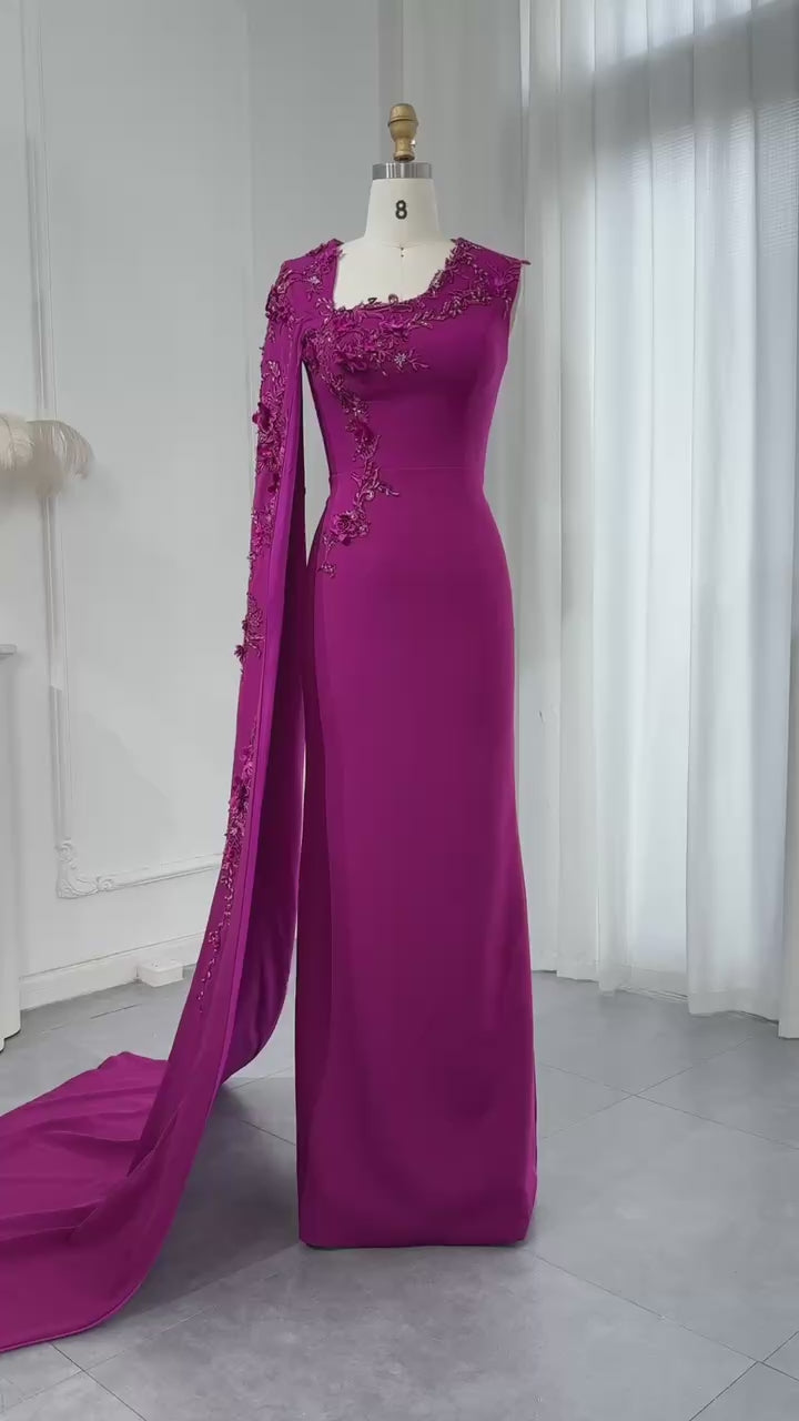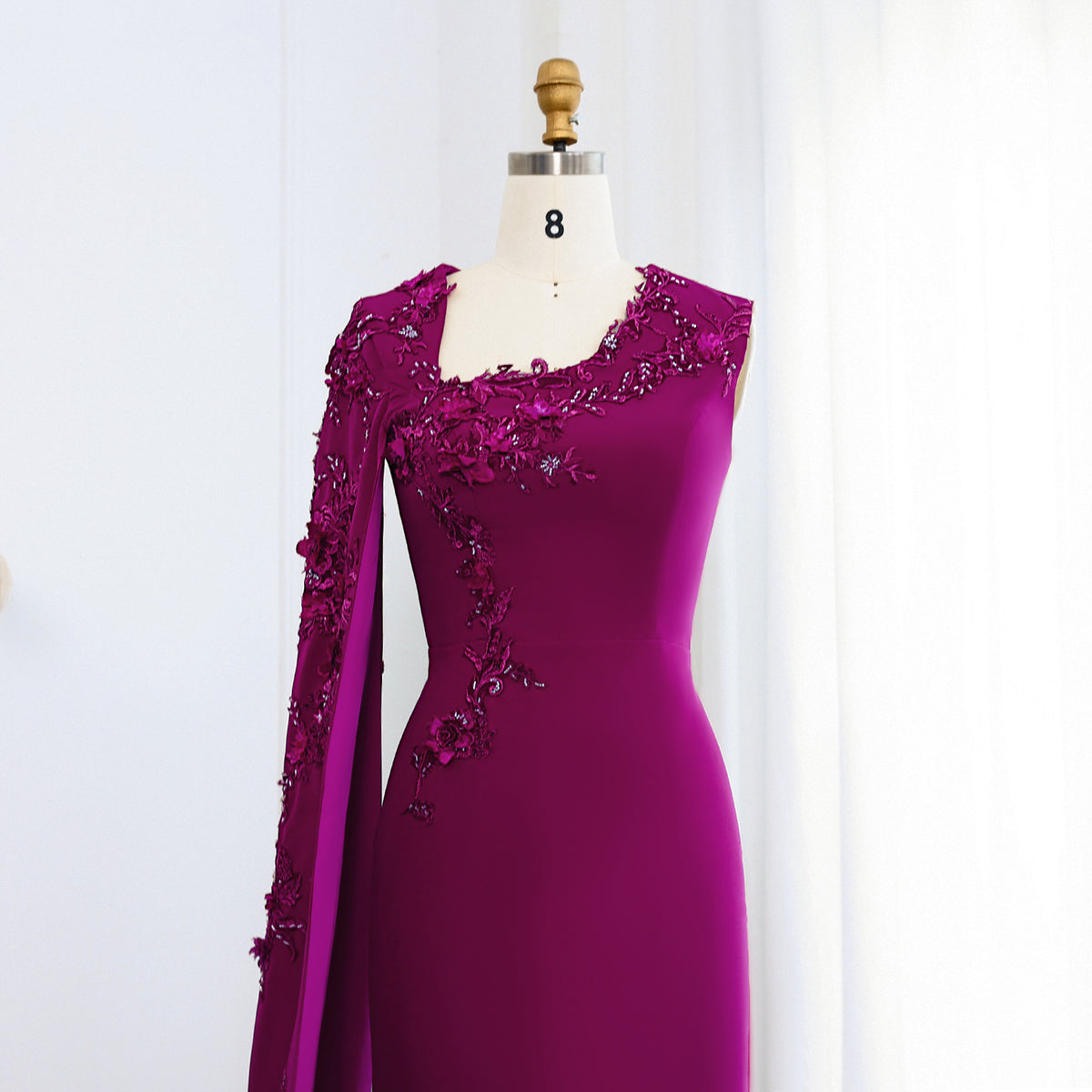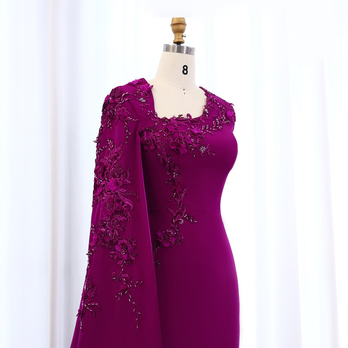 Luxury Appliques Fuchsia Evening Dress with Cape Sleeve SF105