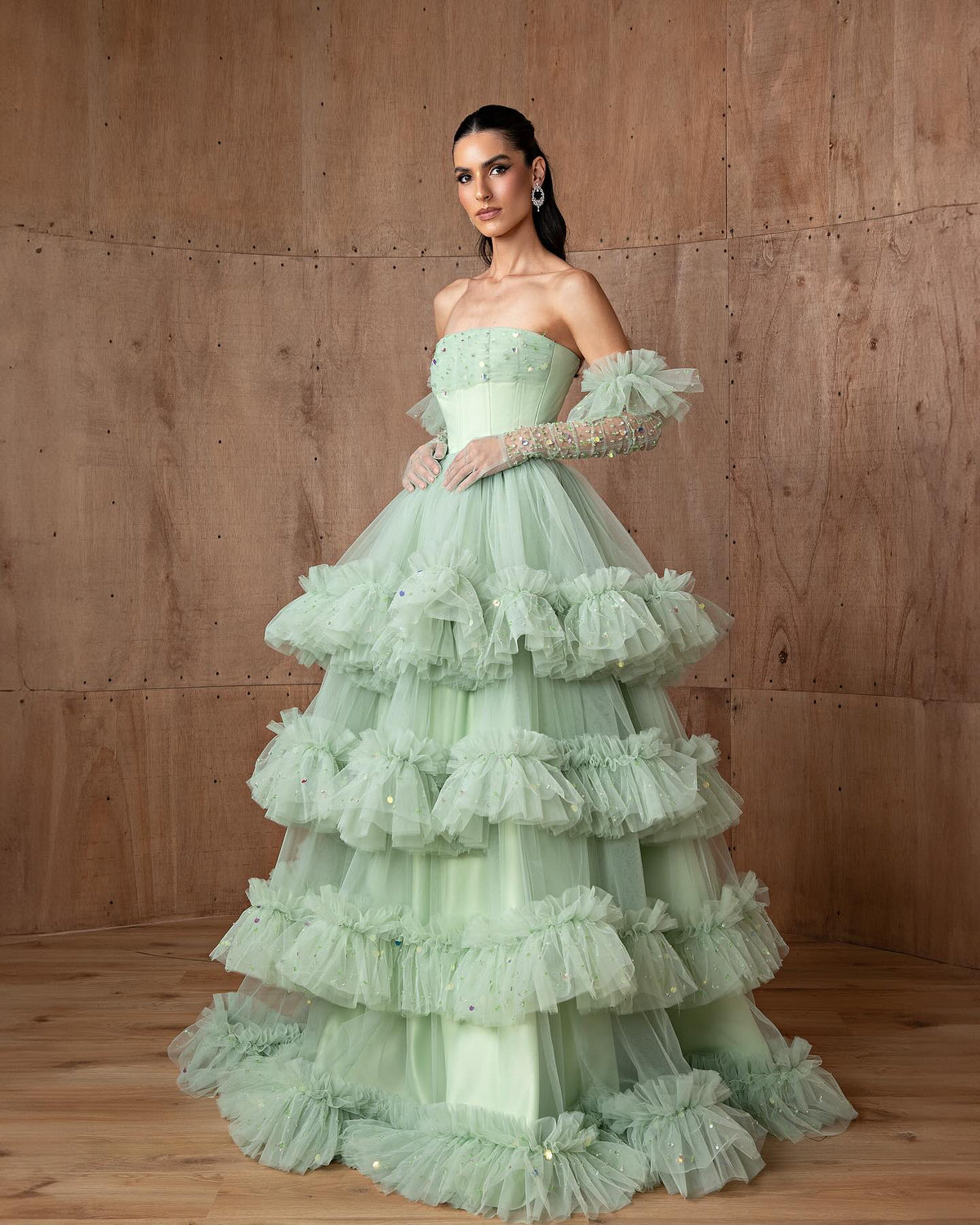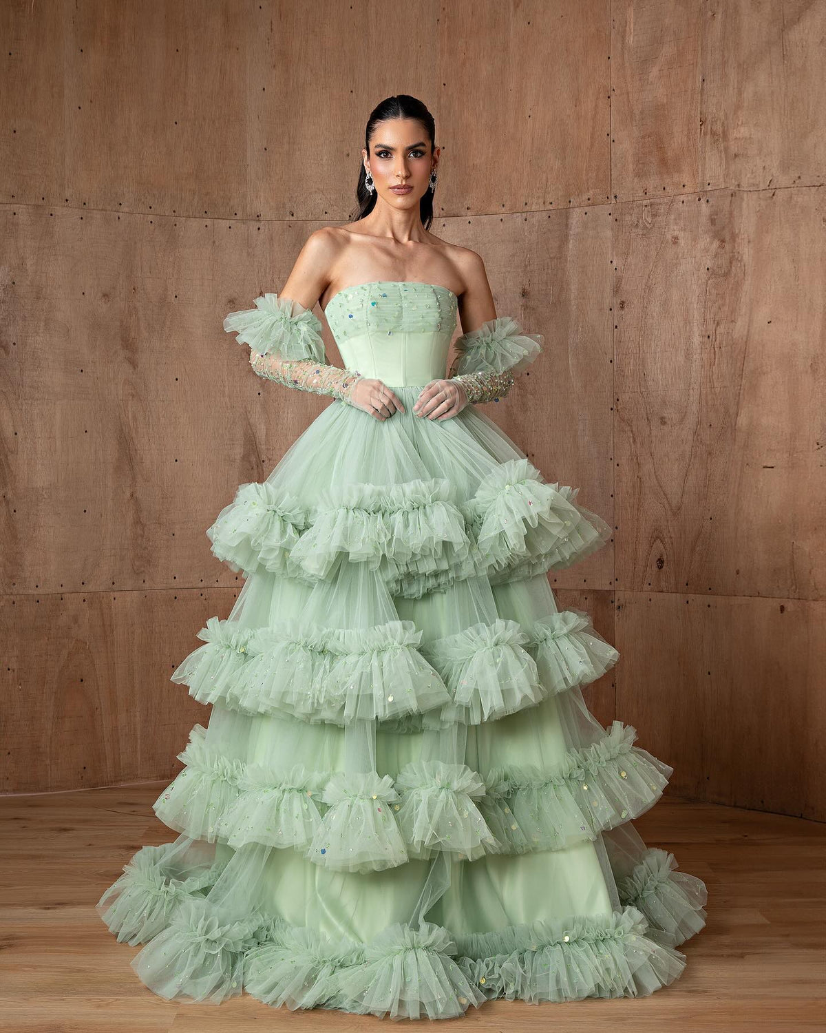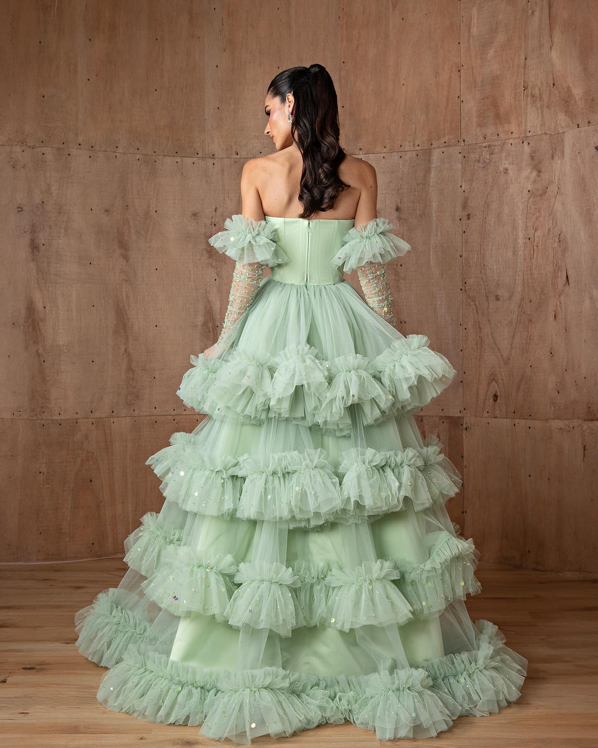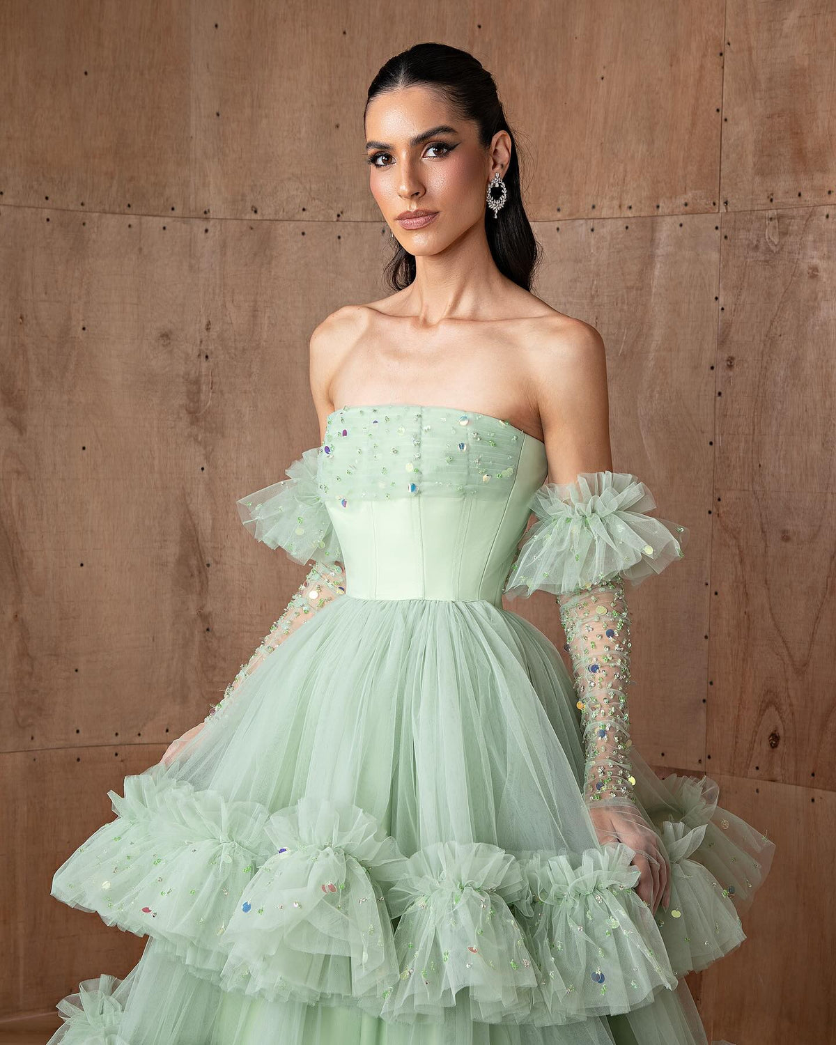 Luxury Beaded Sage Green Tiered Evening Dress with Glove SF381