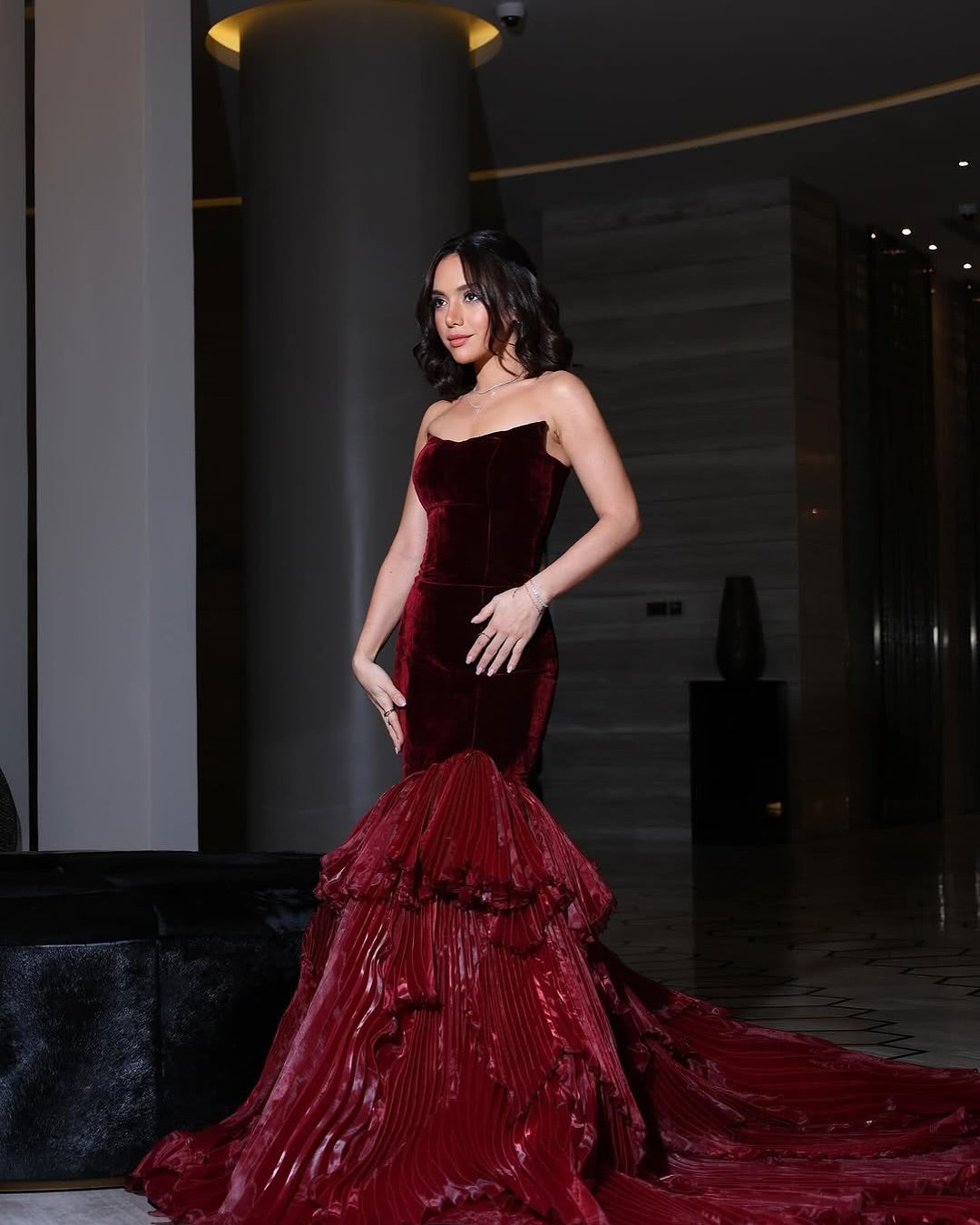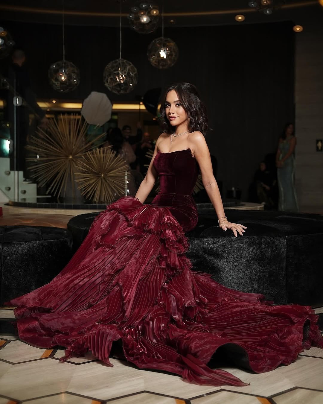 Elevate your evening look with our Luxury Burgundy Strapless Mermaid Ruffles Evening Dress SF157. Made from high-quality materials, this dress boasts a strapless design that accentuates your curves, while the mermaid silhouette and ruffle detailing add a touch of sophistication. Perfect for formal events and special occasions.