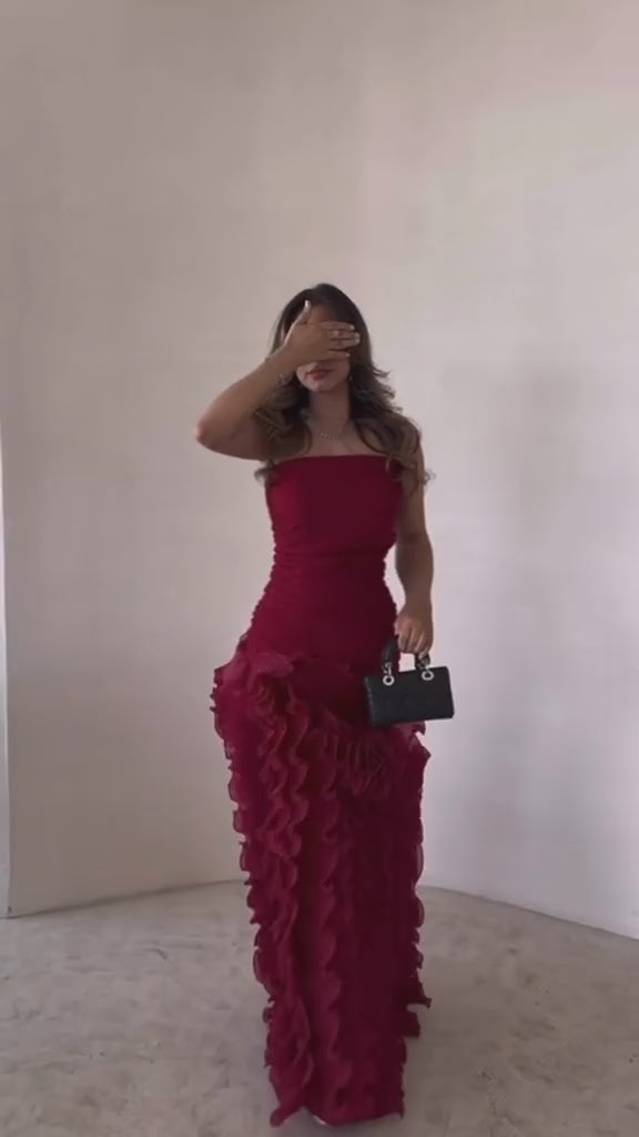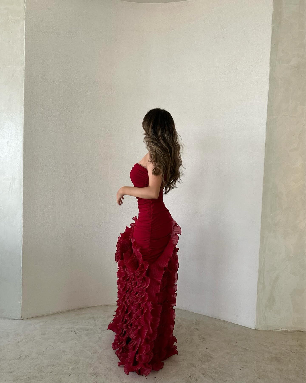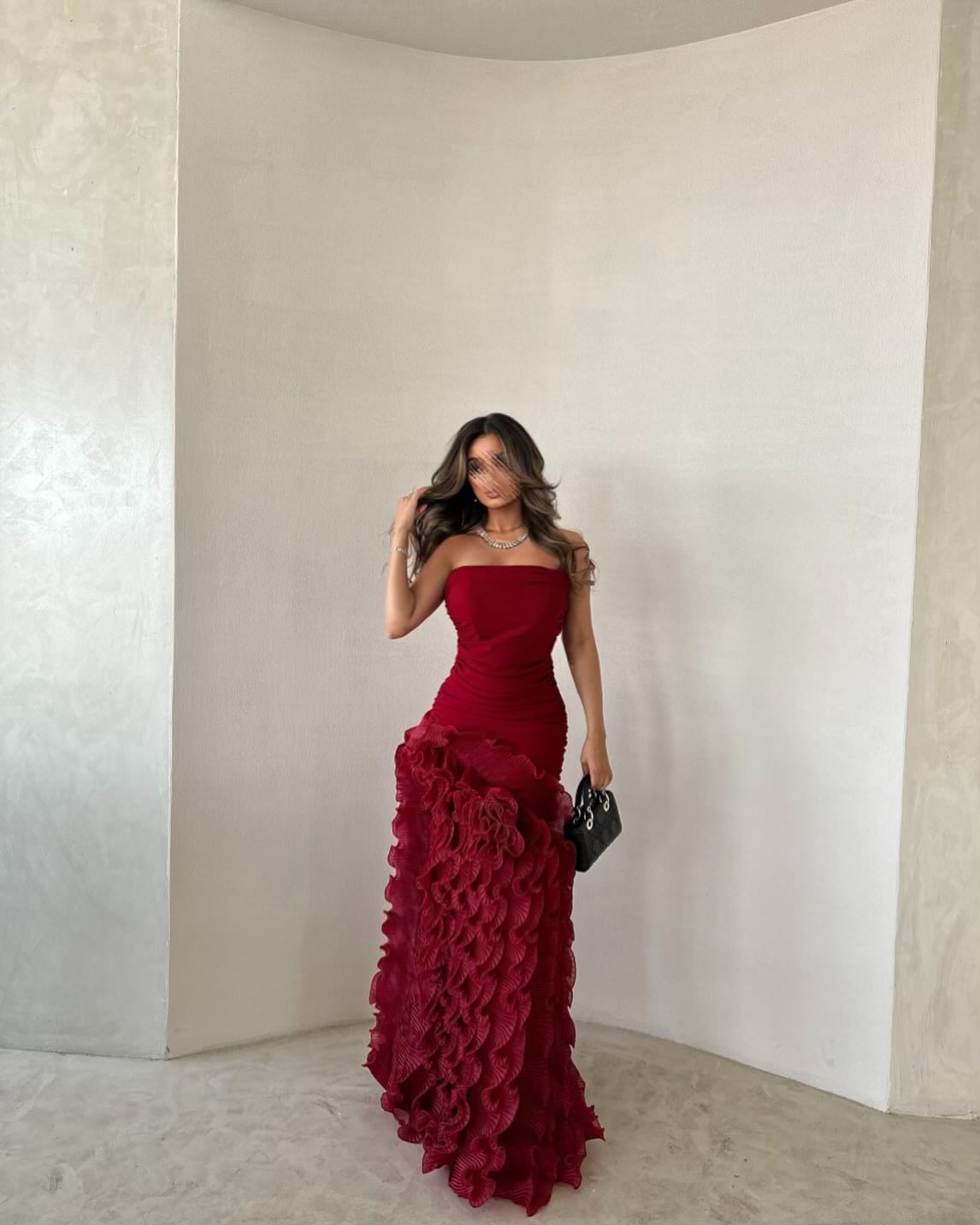 Luxury Burgundy Strapless Ruffles Mermaid Evening Dress SF410