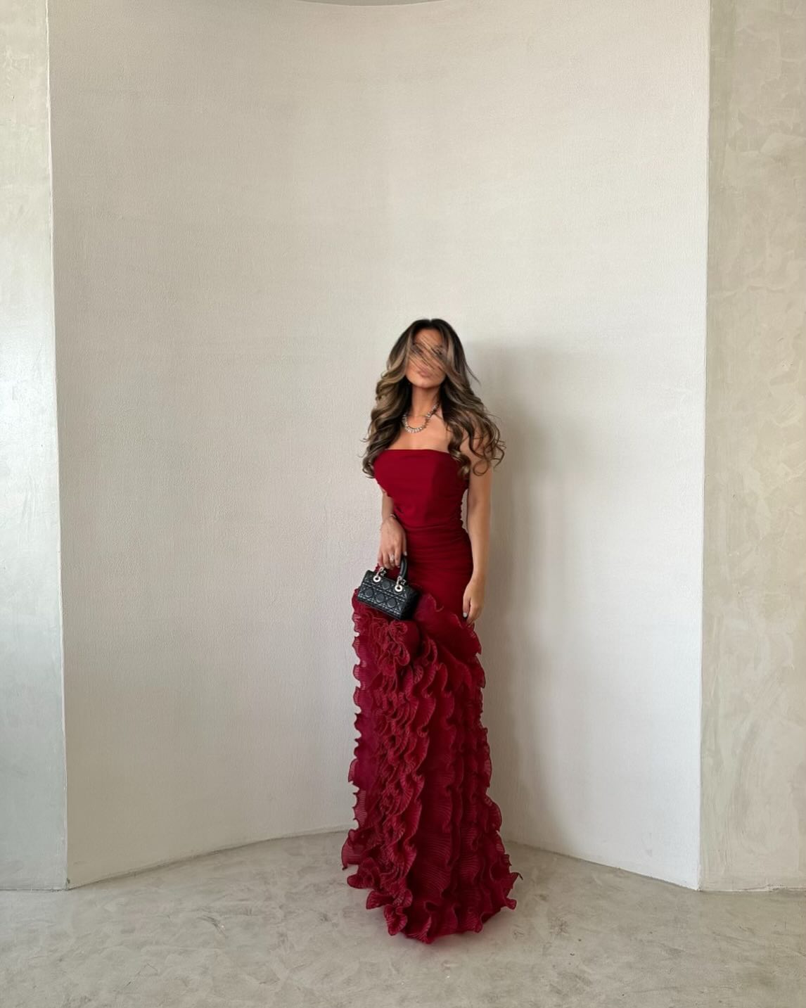 Enhance your evening look with this luxurious Burgundy Strapless Ruffles Mermaid Evening Dress SF410. The elegant mermaid style and strapless design offer a timeless and classic silhouette, while the intricate ruffles add a touch of drama and sophistication. Perfect for formal events, this dress exudes luxury and sophistication.