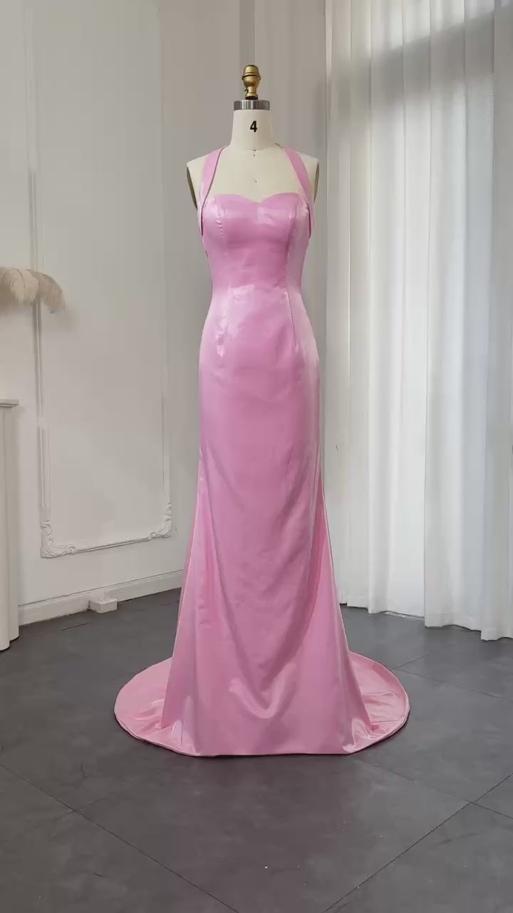 Elevate your evening attire with our Luxury Halter Pink Mermaid Satin Evening Dress with Train SF109. Crafted from high-quality satin, this stunning dress features a figure-flattering mermaid silhouette and a striking halter neckline. The train adds an elegant touch, making it perfect for any formal event.