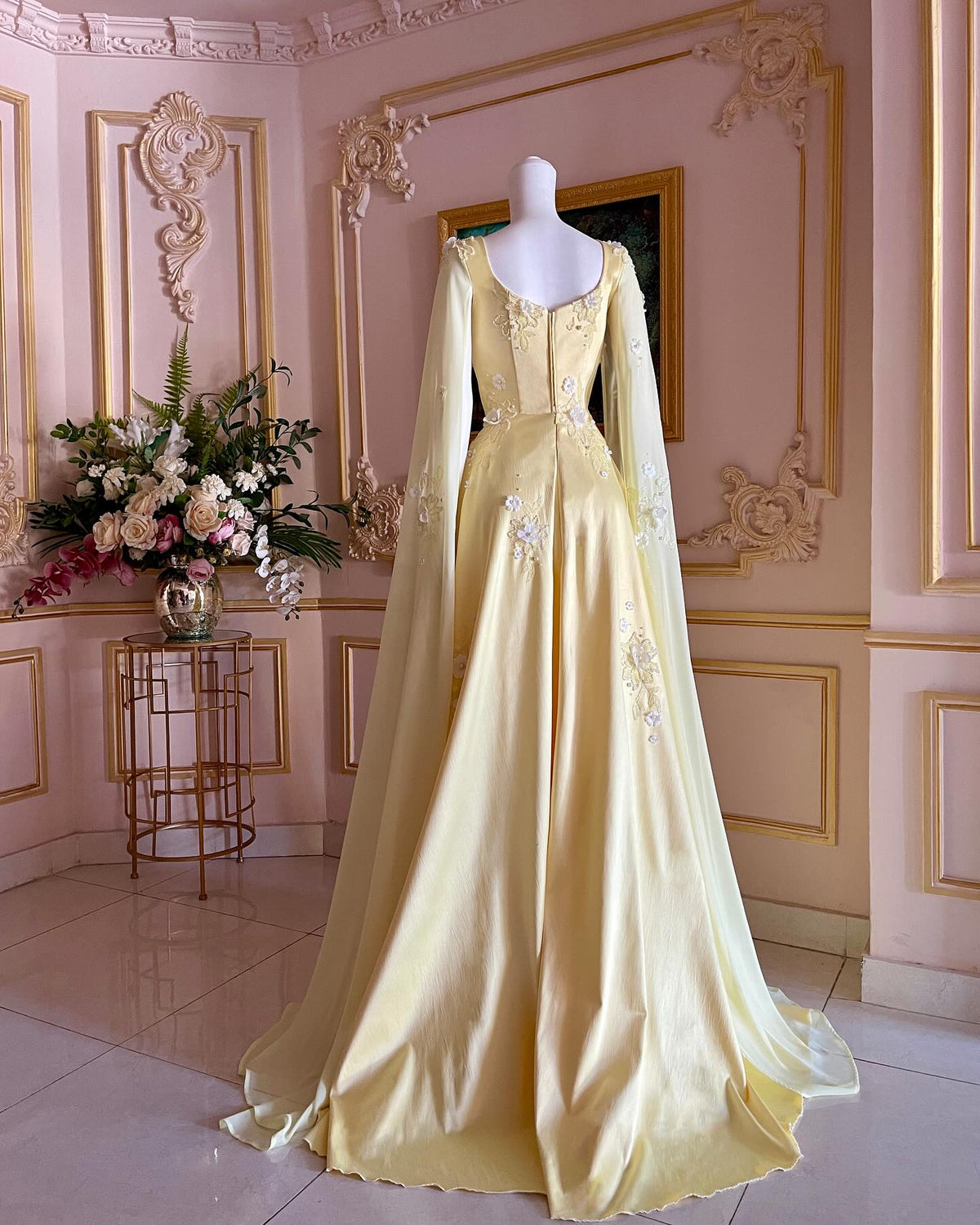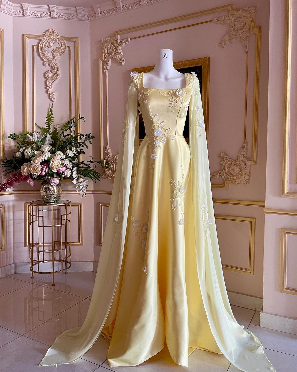 Luxury Pearls Yellow 3D Floral Evening Dress with Cape Sleeve SF226