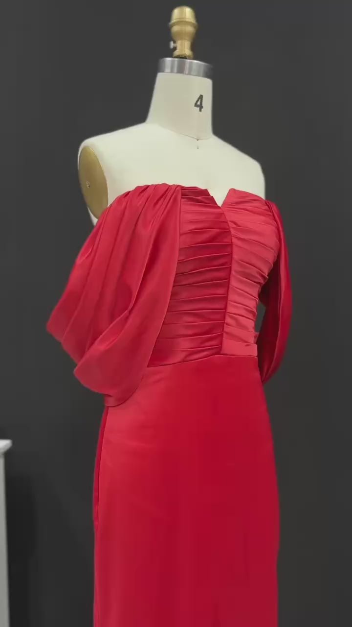 Experience luxury and elegance with our Luxury Red Off Shoulder Sheath Satin Long Evening Dress SF056. The off shoulder design adds a touch of sophistication while the satin fabric drapes beautifully on your body. Perfect for any special occasion, this dress is sure to make you feel confident and glamorous.