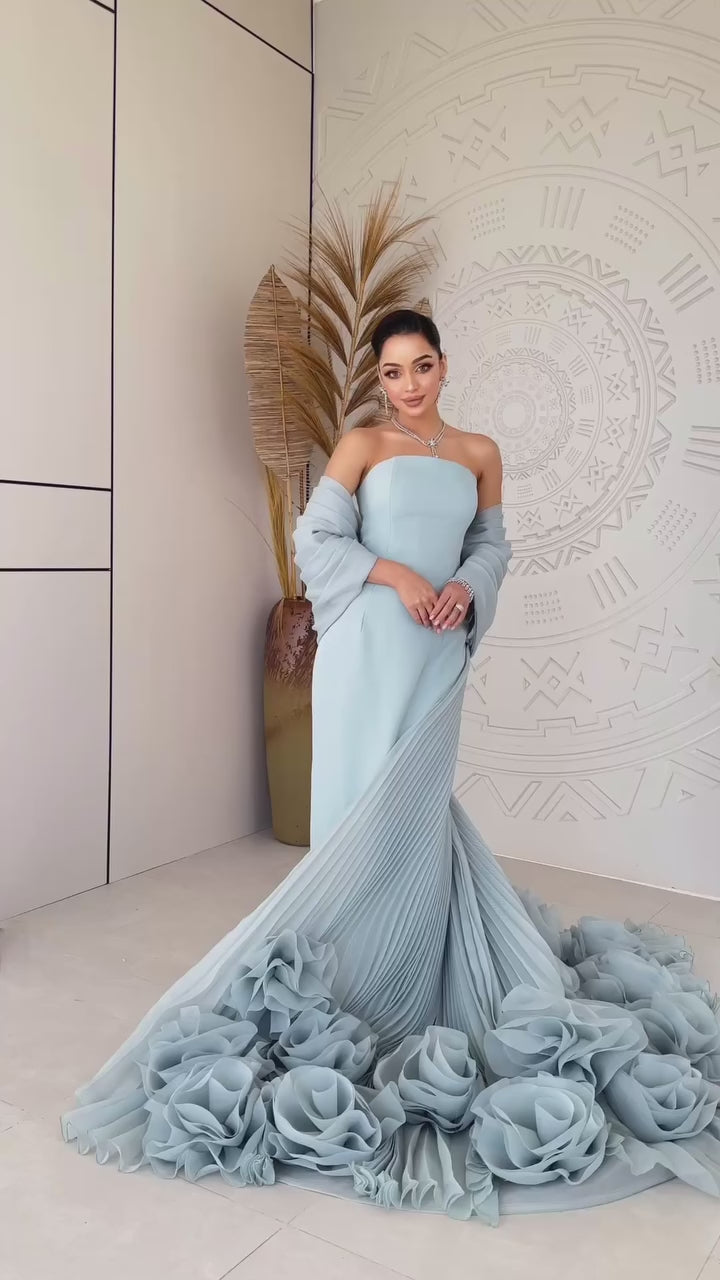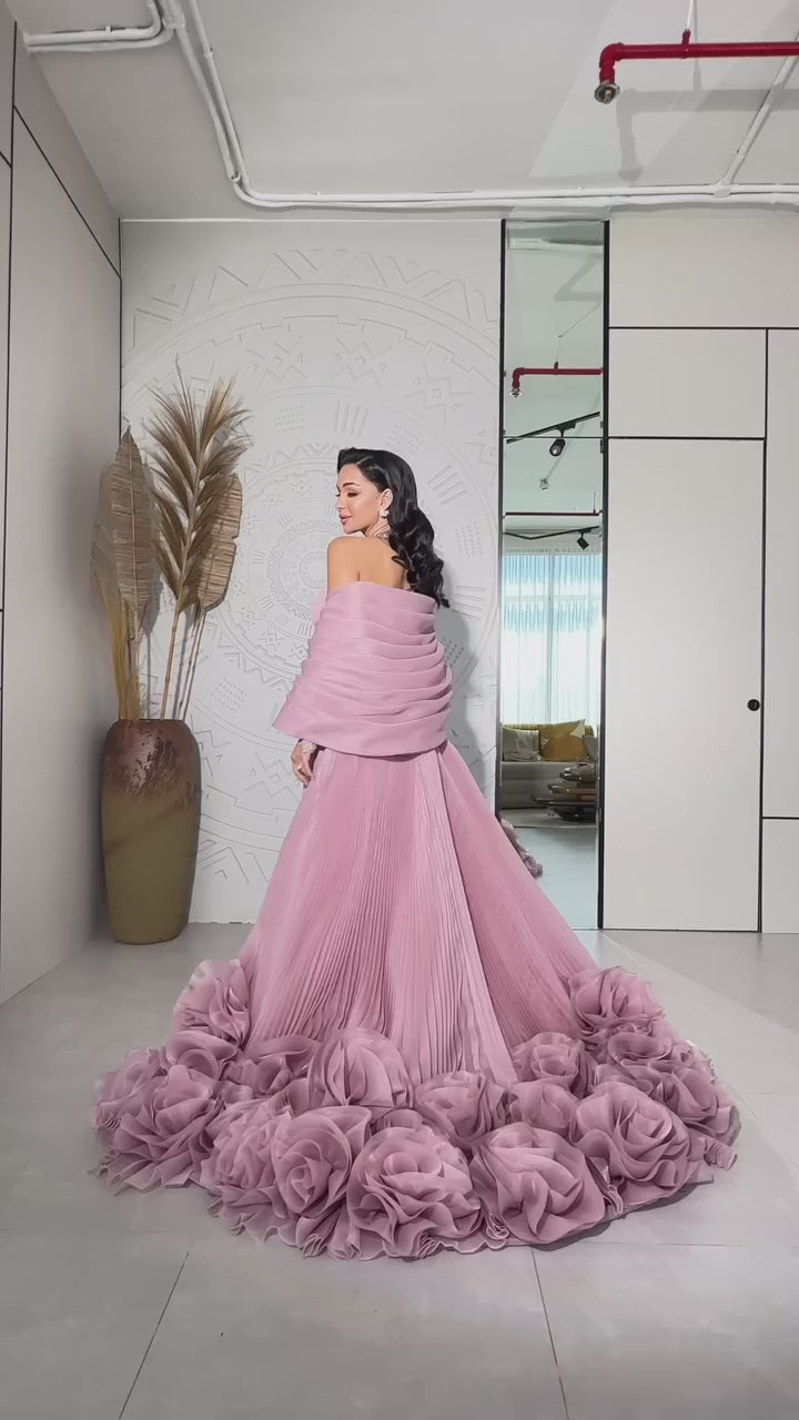 This elegant Luxury Strapless Pink Evening Dress (SF485) features a stunning 3D floral overskirt, adding a touch of romance to your attire. With its strapless design, this dress will accentuate your figure, making you feel confident and sophisticated. Perfect for any evening event, this dress is a must-have for any fashion-forward woman.