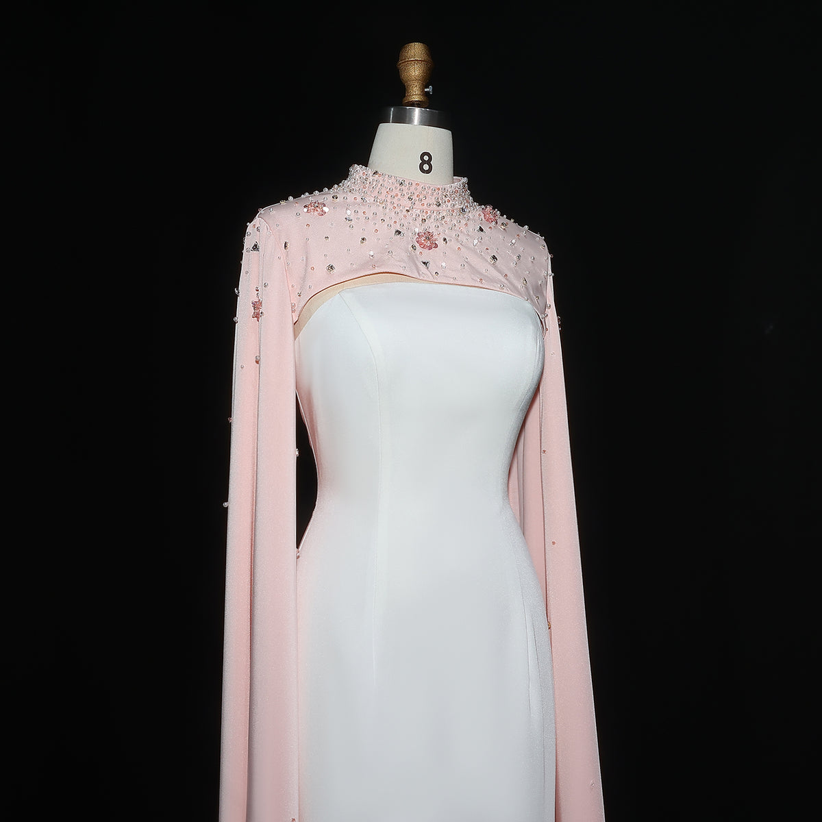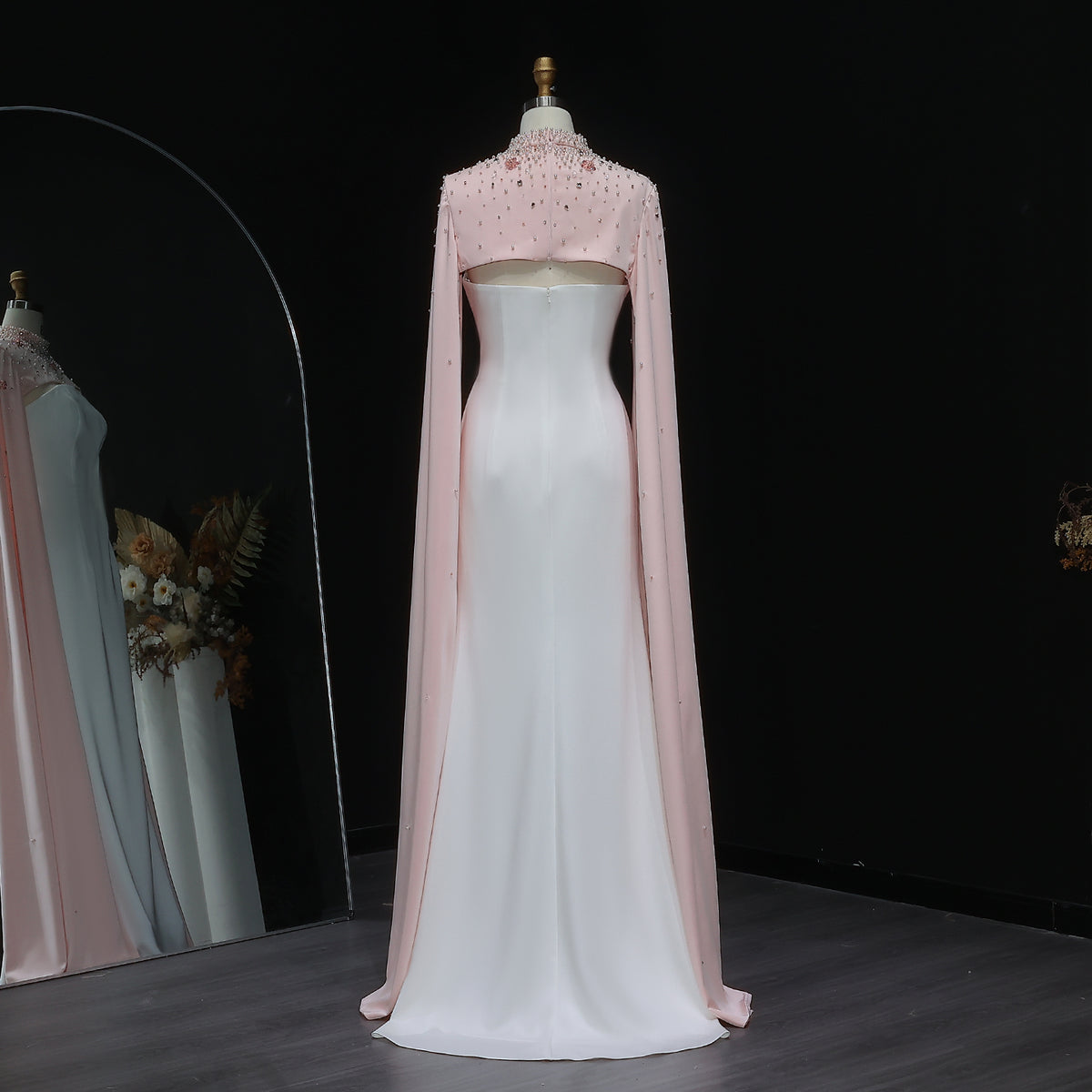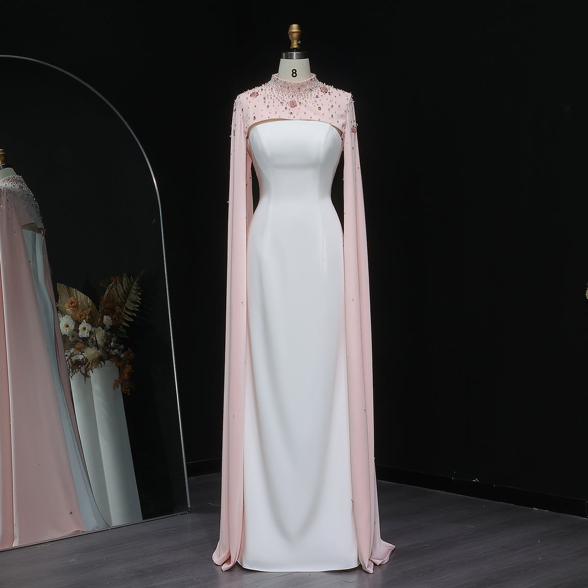 This luxurious white sheath evening dress is elevated with a sparkling crystal cape, adding a touch of elegance to any special occasion. Crafted with the finest materials, this dress is perfect for making a statement and standing out in a crowd. Its form-fitting silhouette accentuates your figure, making you feel confident and sophisticated.
