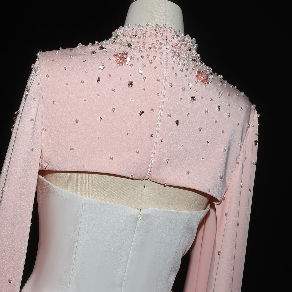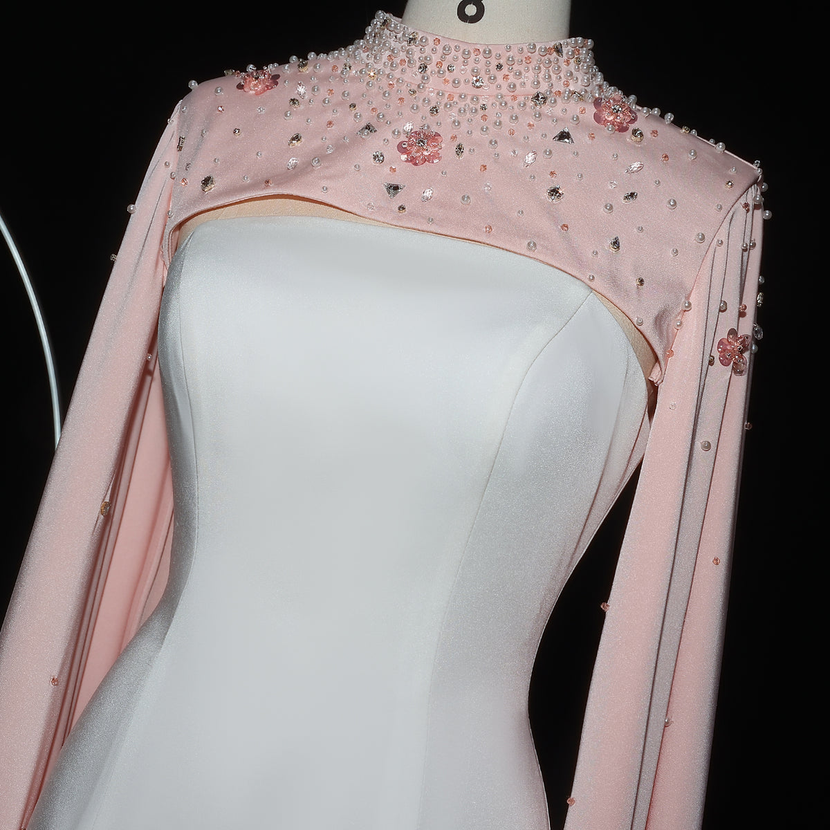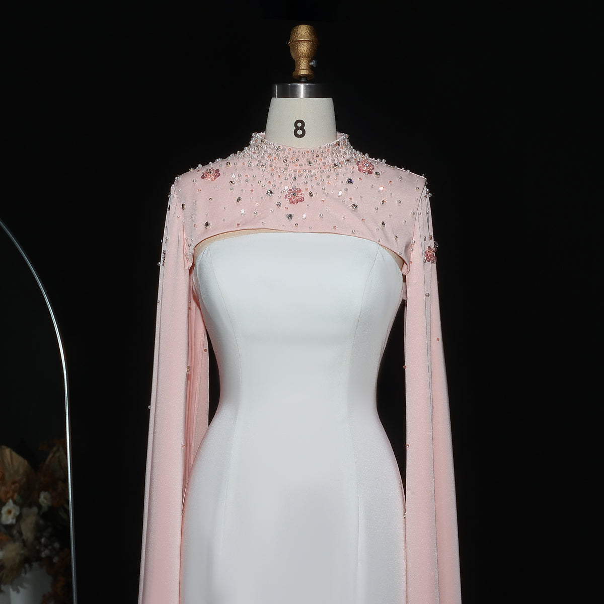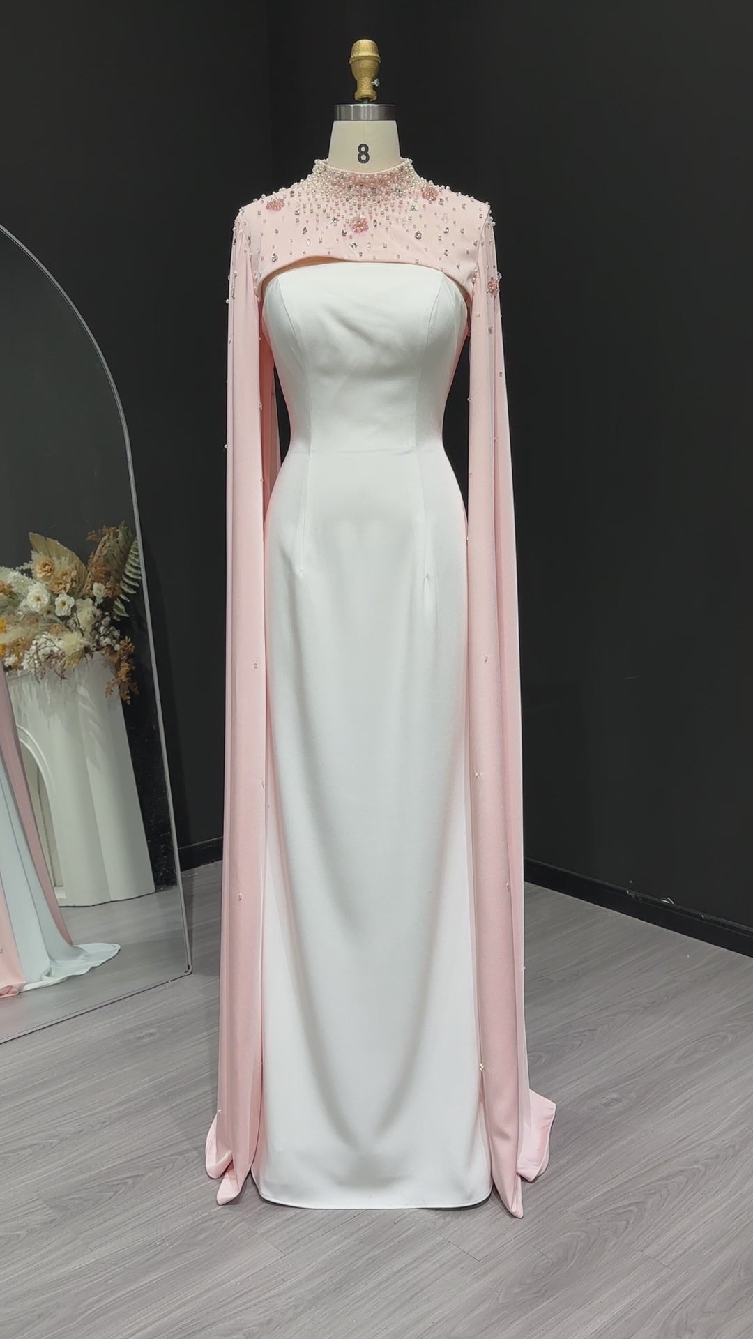 This luxurious white sheath evening dress is elevated with a sparkling crystal cape, adding a touch of elegance to any special occasion. Crafted with the finest materials, this dress is perfect for making a statement and standing out in a crowd. Its form-fitting silhouette accentuates your figure, making you feel confident and sophisticated.