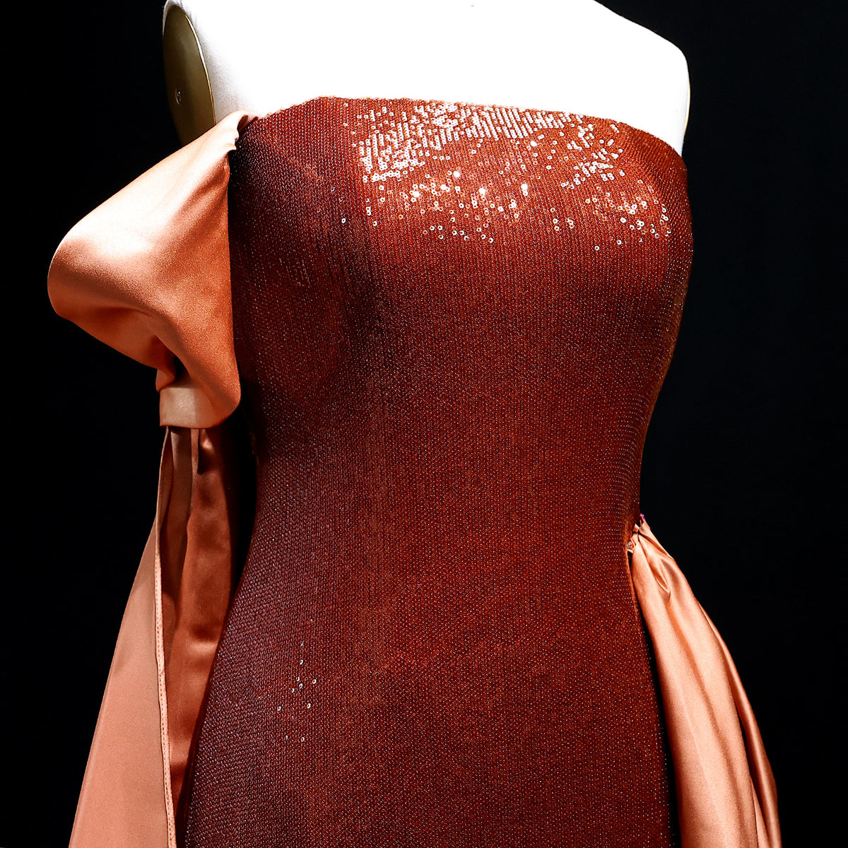 This Stunning Sequined Brown Evening Dress with Overskirt SF236 exudes elegance and sophistication. The sequined embellishments add a touch of glamour, while the overskirt adds dimension and movement. Perfect for any evening event, this dress is sure to make you stand out and feel like a true fashionista.