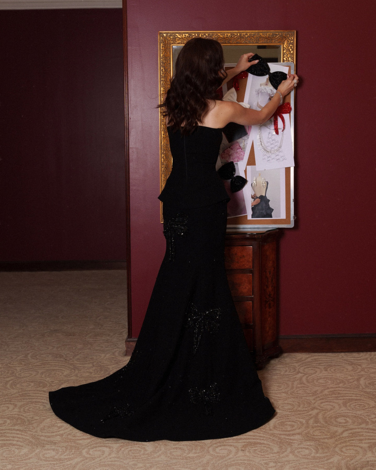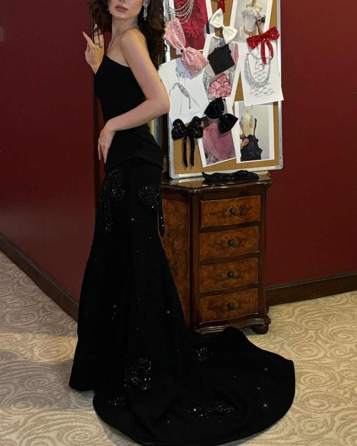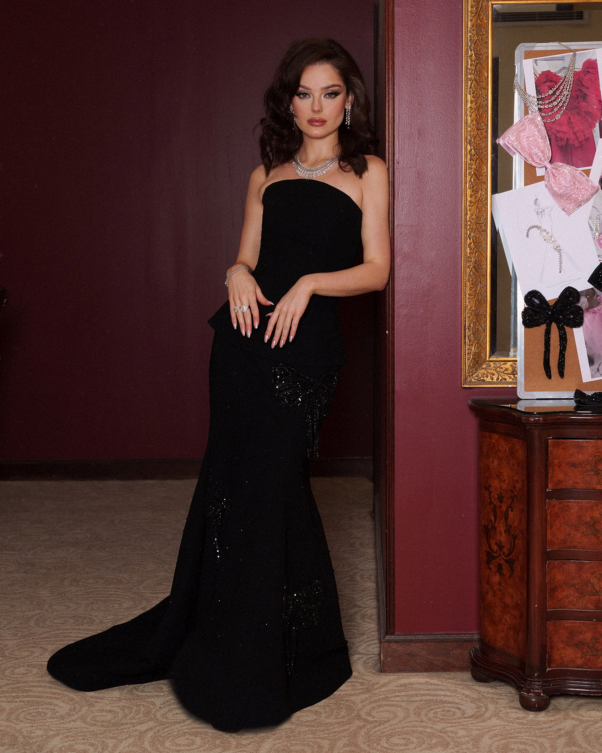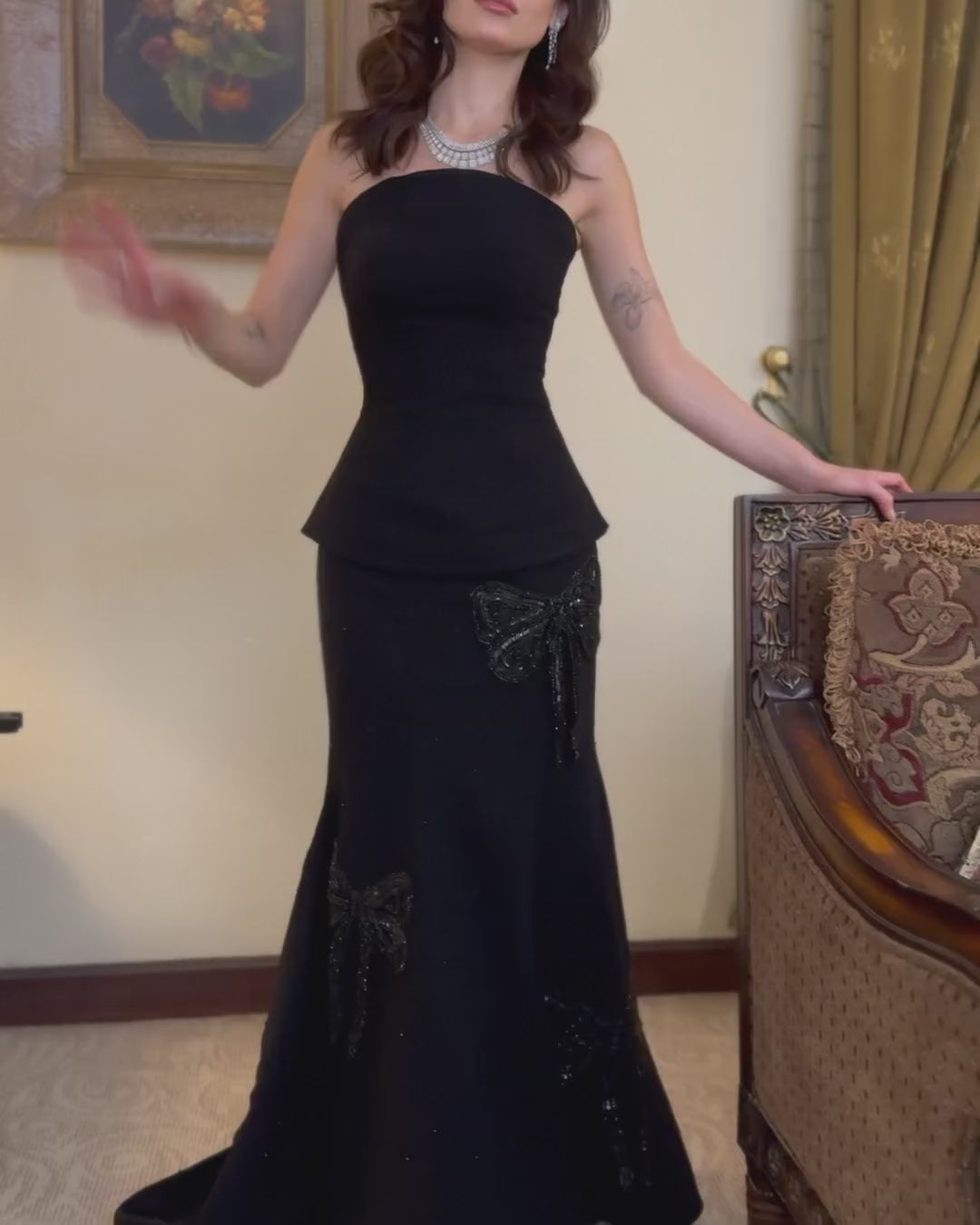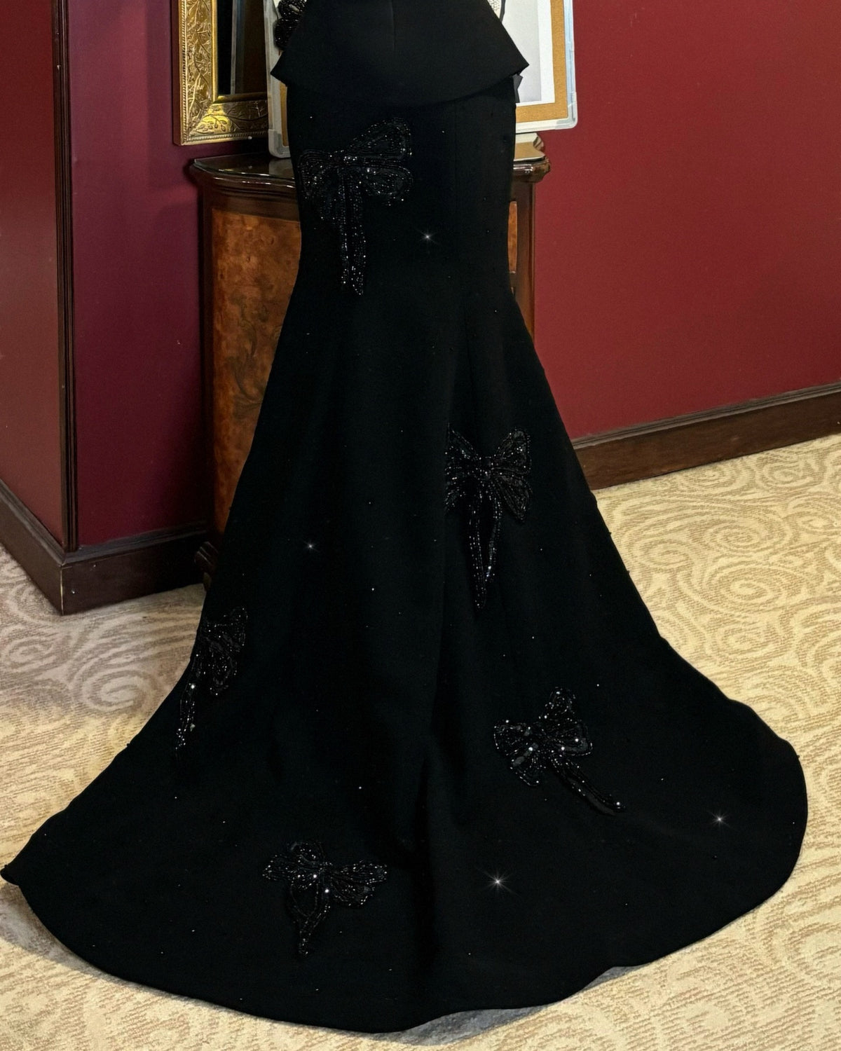 Elevate your evening look with our Stunning Strapless Black Evening Dress. This dress features a flattering strapless design and intricate butterfly beadwork that adds a touch of elegance. Made with high-quality materials, this dress is perfect for any formal occasion.