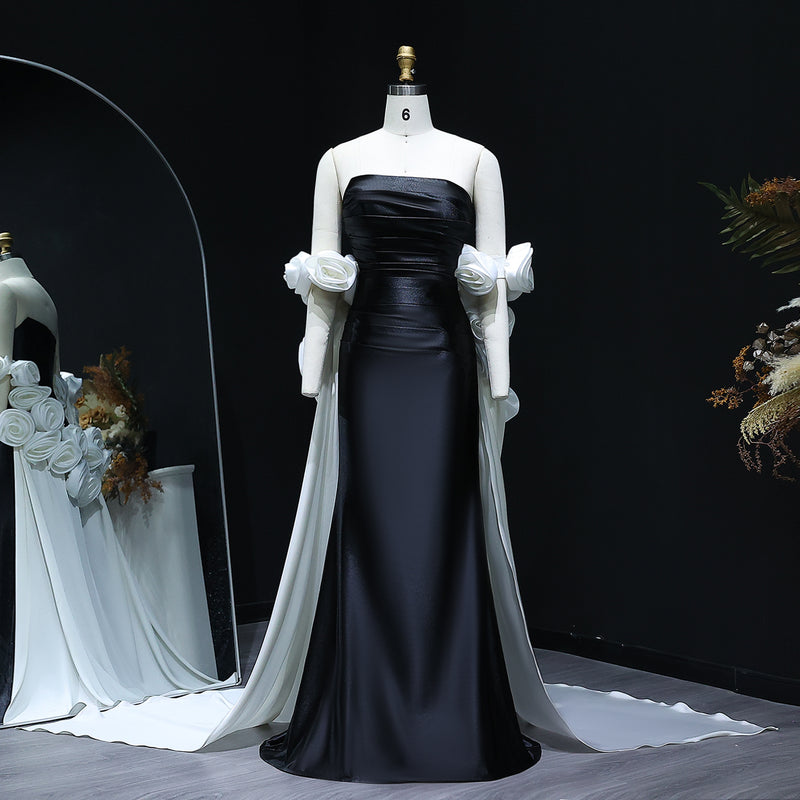 Luxury Floral Black Strapless Evening Dress with Overskirt SF262