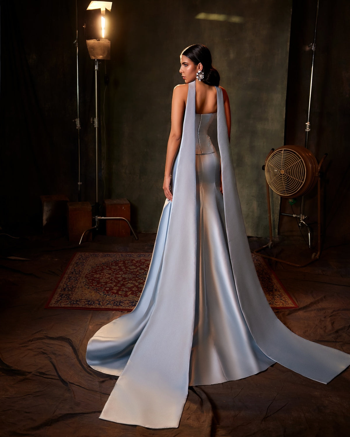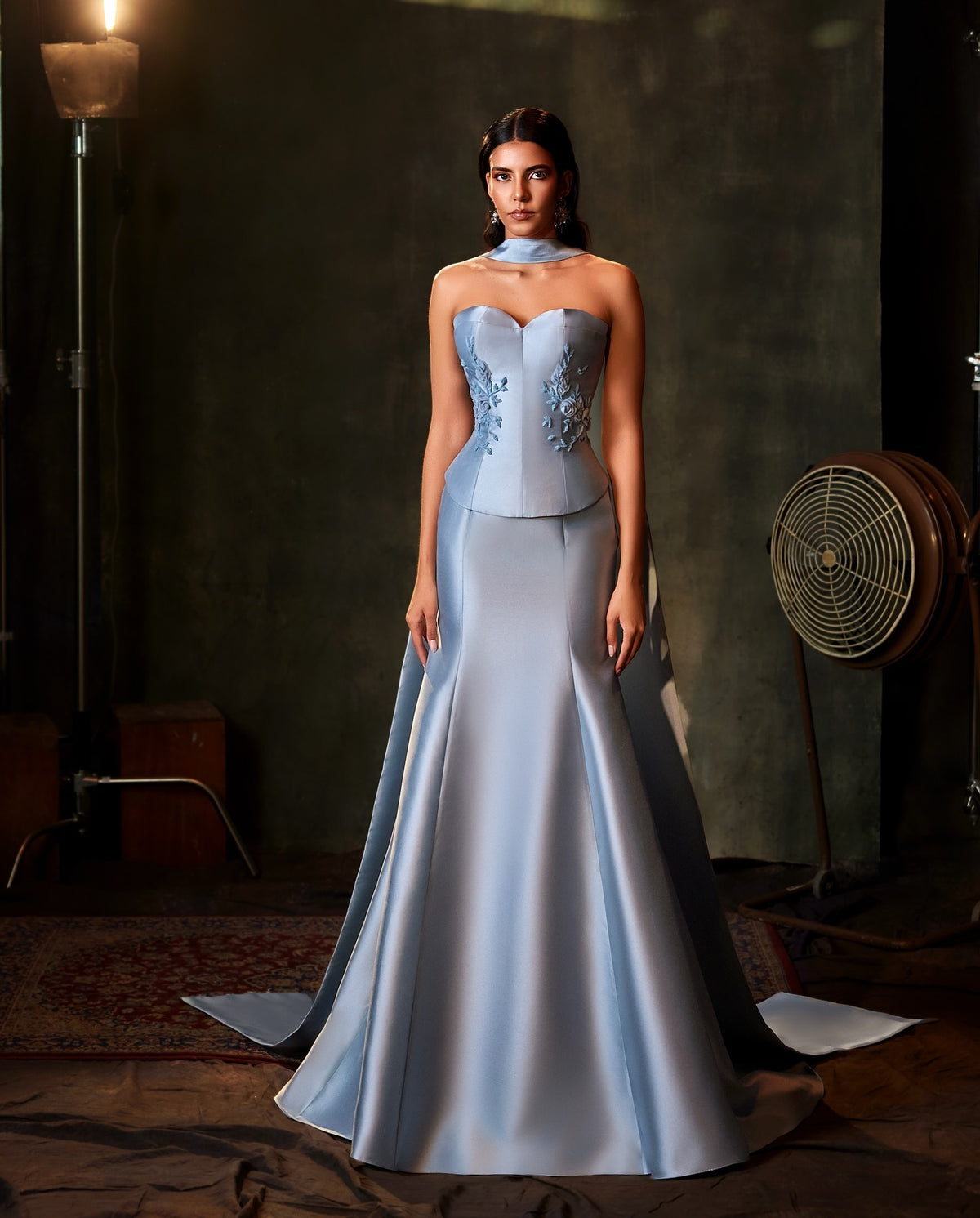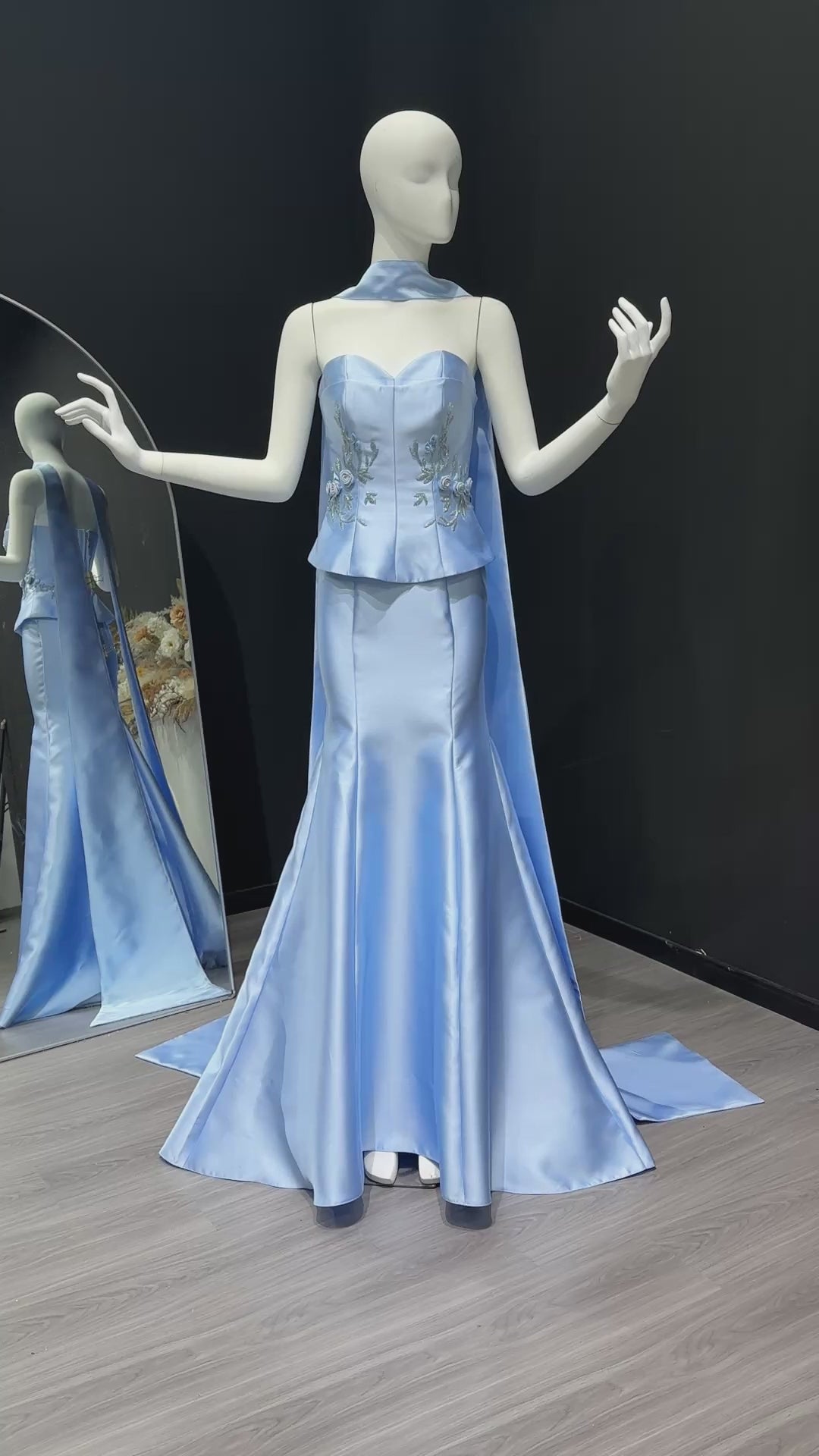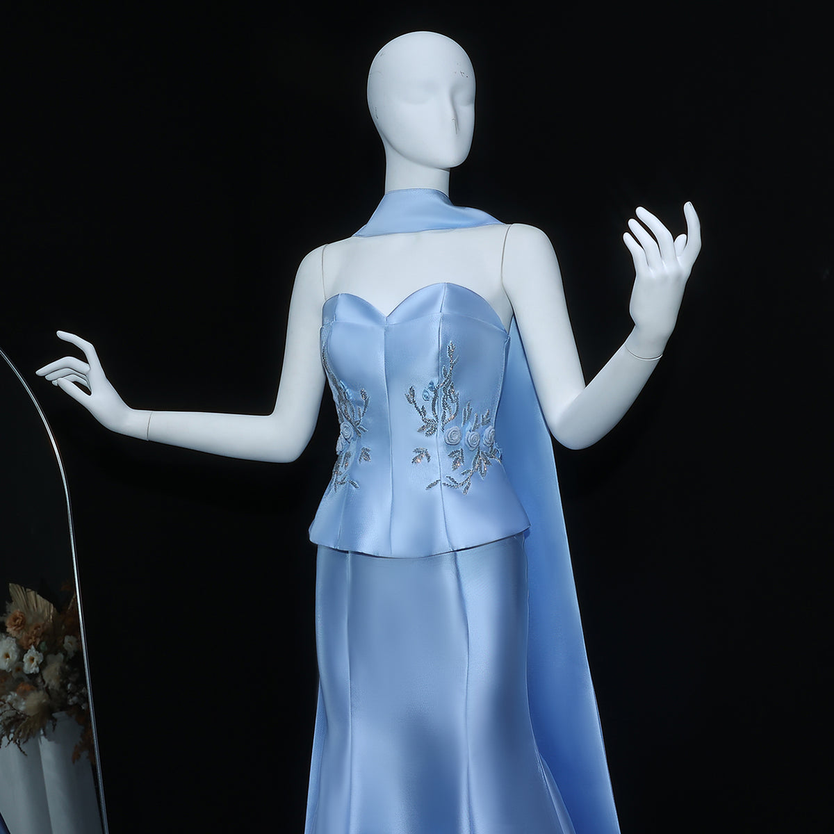 Graceful 3D Floral Blue Mermaid Evening Dress with Scarf SS245