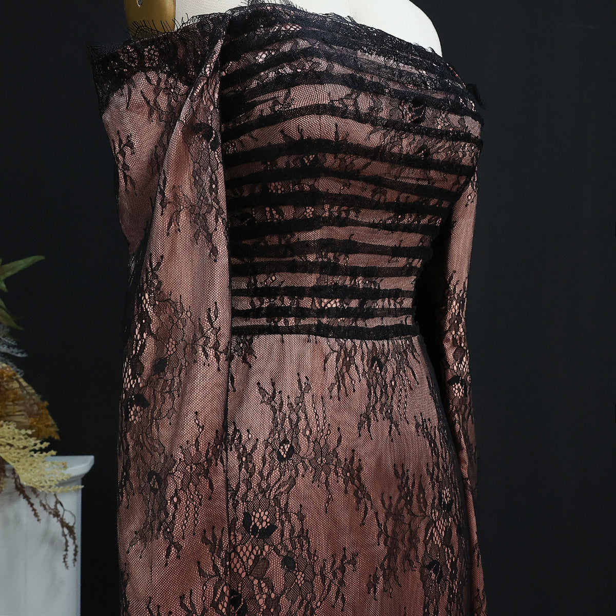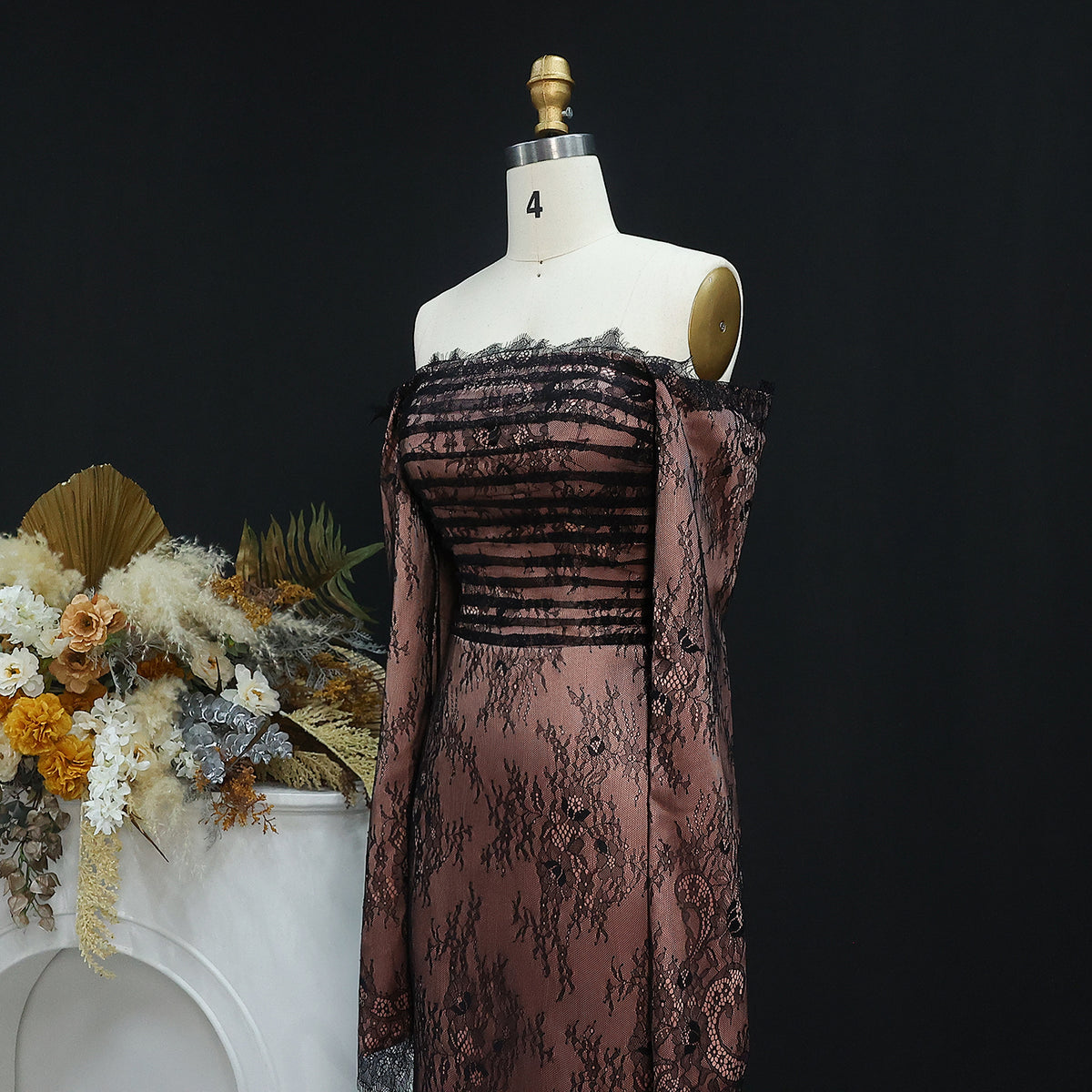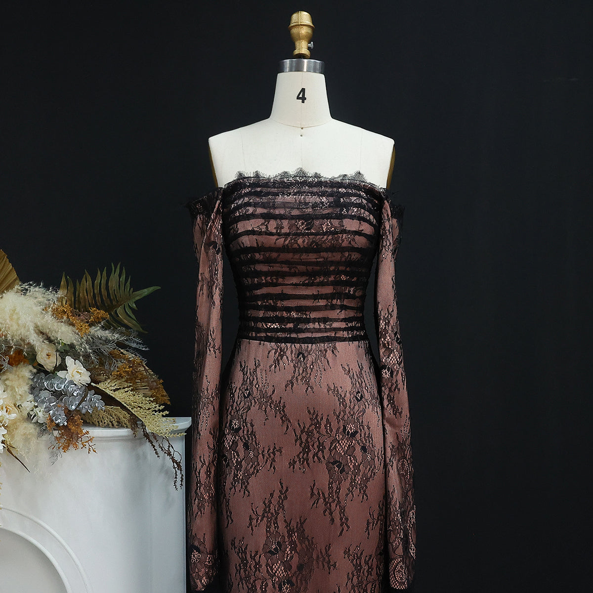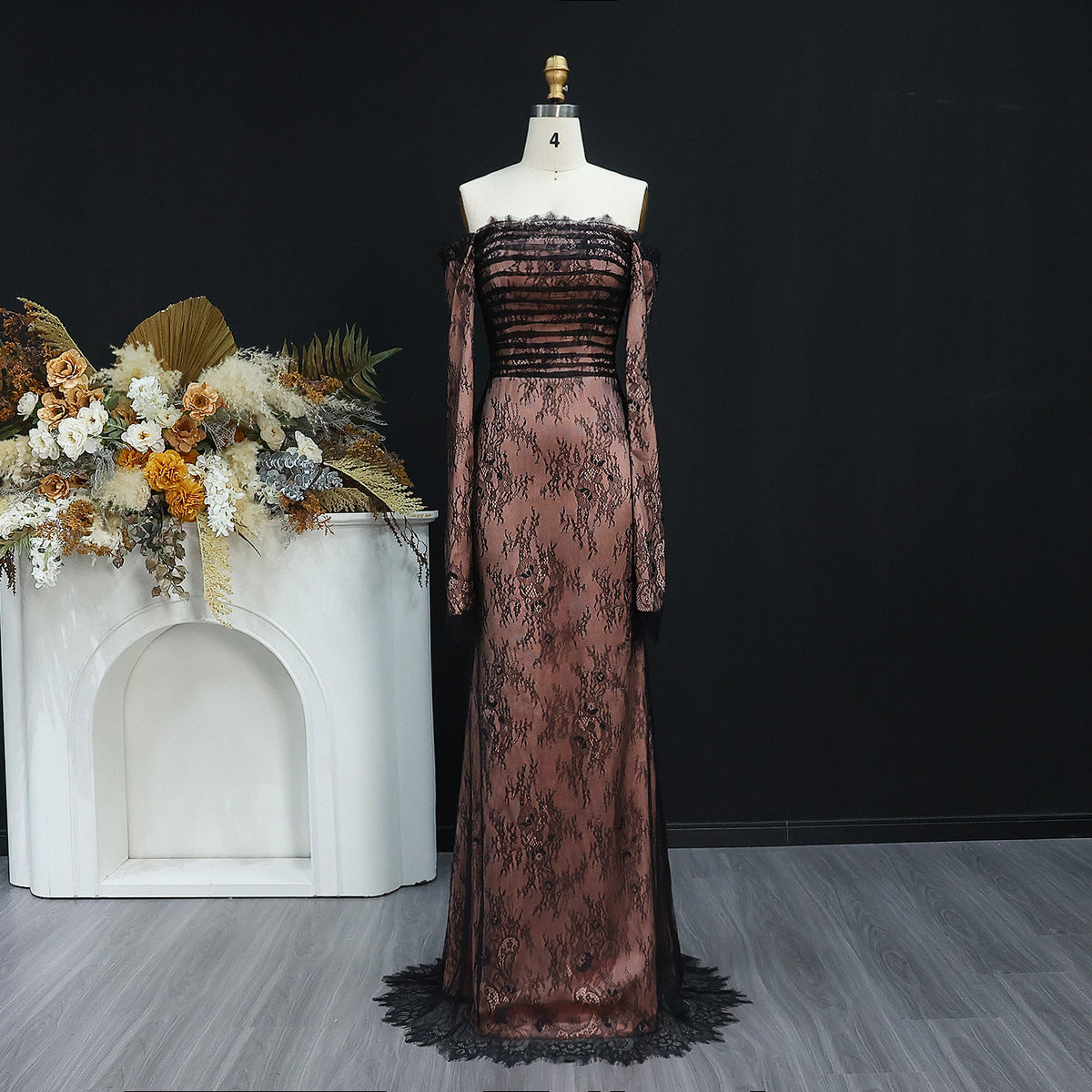 This stunning, luxury black evening dress is the epitome of elegance. Featuring long sleeves and a strapless neckline, it is adorned with delicate lace for a touch of glamour. The perfect choice for any formal event or special occasion, this dress will make you feel confident and sophisticated.