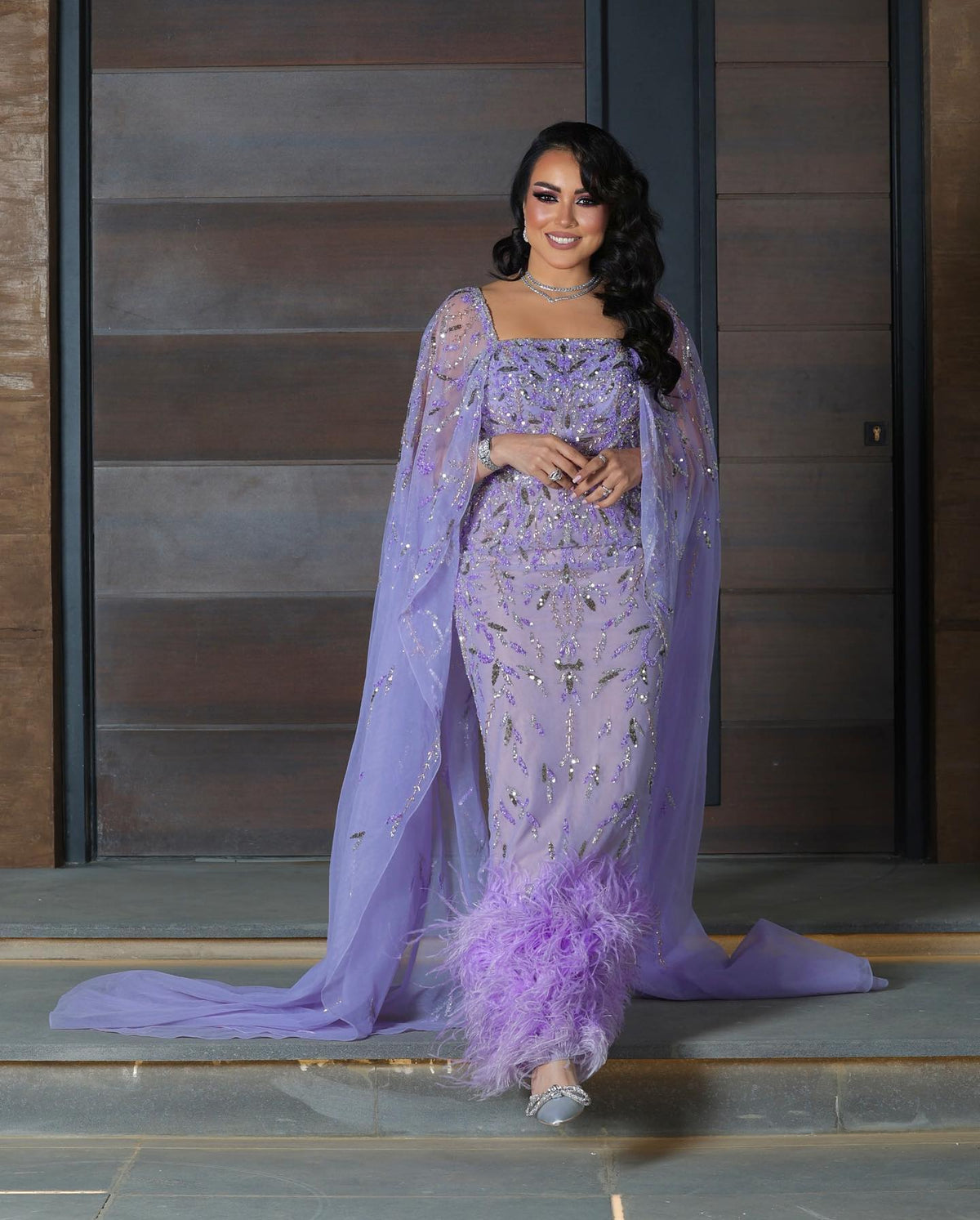 Luxury Feathers Lilac Evening Dress with Cape Sleeves SS381