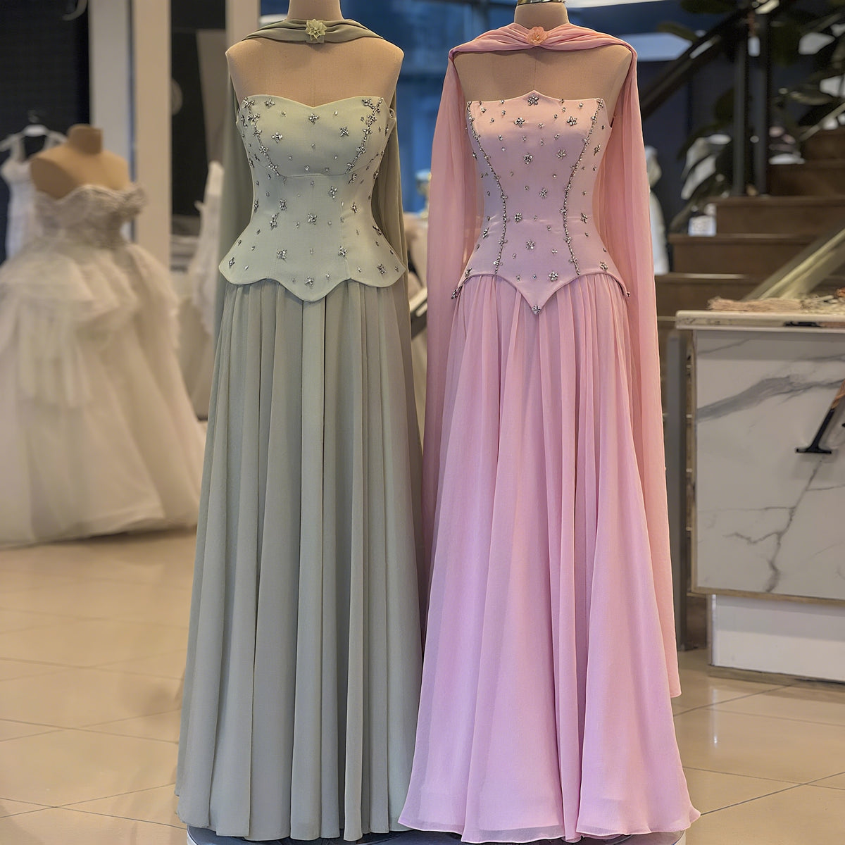 This elegant evening dress features a sage green hue enhanced by intricate crystal beadwork throughout the corset bodice, creating a refined and sophisticated silhouette. Designed to contour and support, the structured corset highlights the waist, while the delicate embellishments add subtle sparkle perfect for formal occasions. Crafted with attention to detail, this gown combines timeless elegance with modern craftsmanship for a standout presence at any event.