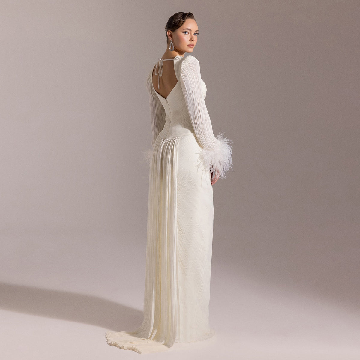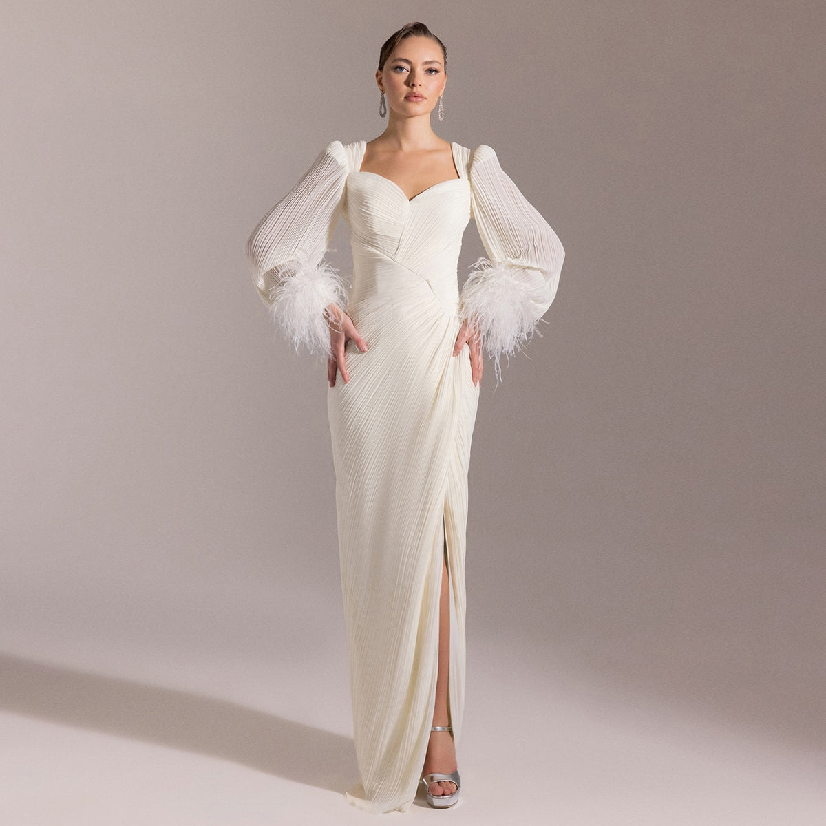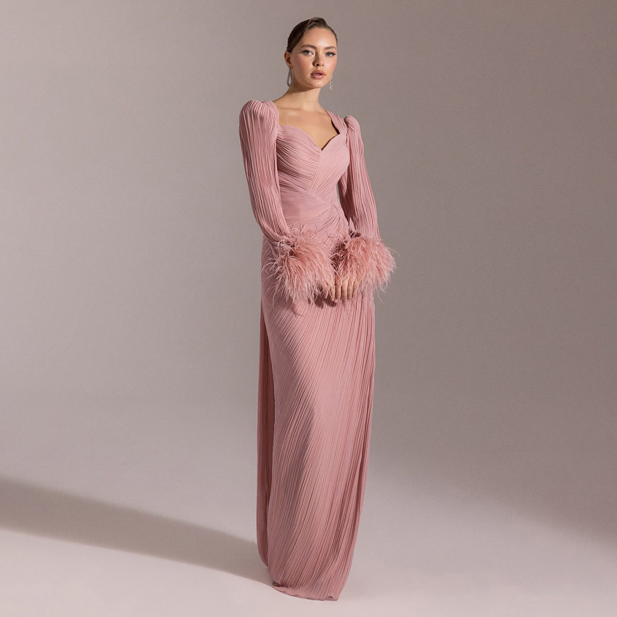 This Luxury Feather Fuchsia Evening Dress features long sleeves, intricate feather detailing, and an elegant overskirt that creates a graceful and dynamic silhouette. The vibrant fuchsia shade adds bold sophistication, while the feather embellishments provide texture and refined movement. Designed for distinguished occasions, this dress combines classic elegance with contemporary flair.