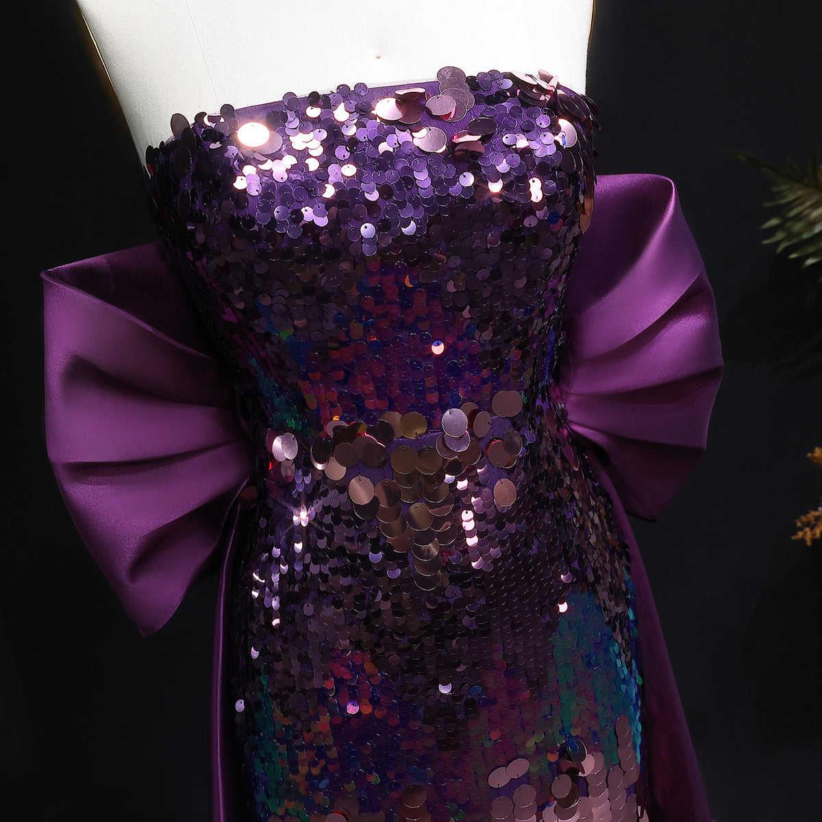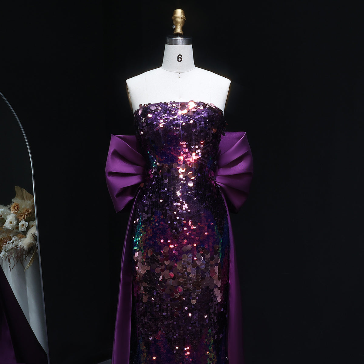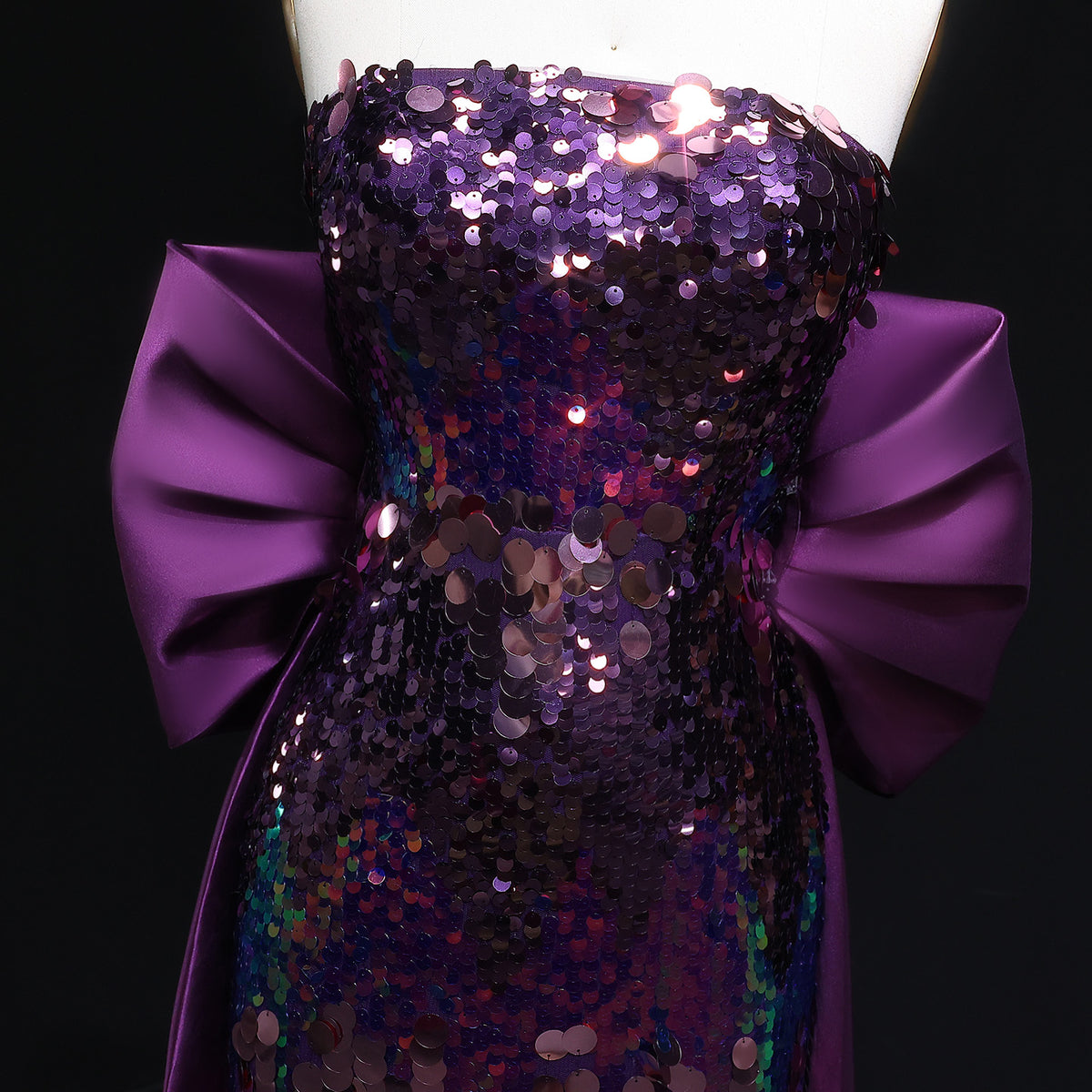 Elevate your evening look with this luxury purple sequin dress, featuring a dramatic big bow and elegant train. Crafted to catch the light beautifully, it offers a sophisticated silhouette ideal for formal occasions. The intricate sequin detailing enhances glamour while the flowing train adds regal movement, making it an exquisite choice for standout elegance.