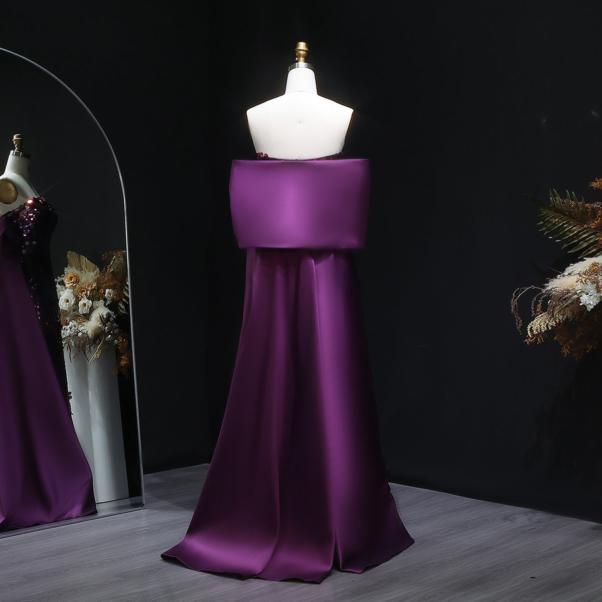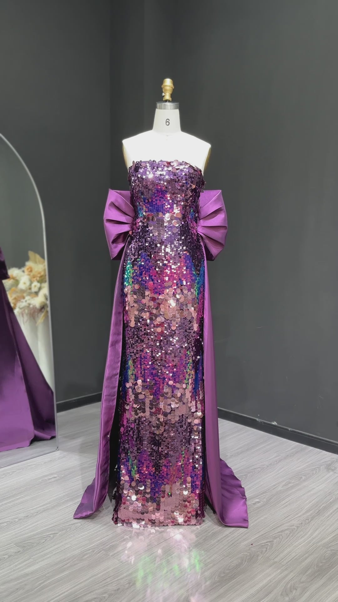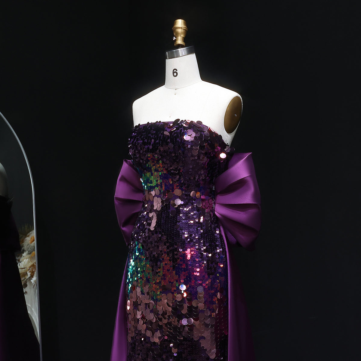 Elevate your evening look with this luxury purple sequin dress, featuring a dramatic big bow and elegant train. Crafted to catch the light beautifully, it offers a sophisticated silhouette ideal for formal occasions. The intricate sequin detailing enhances glamour while the flowing train adds regal movement, making it an exquisite choice for standout elegance.