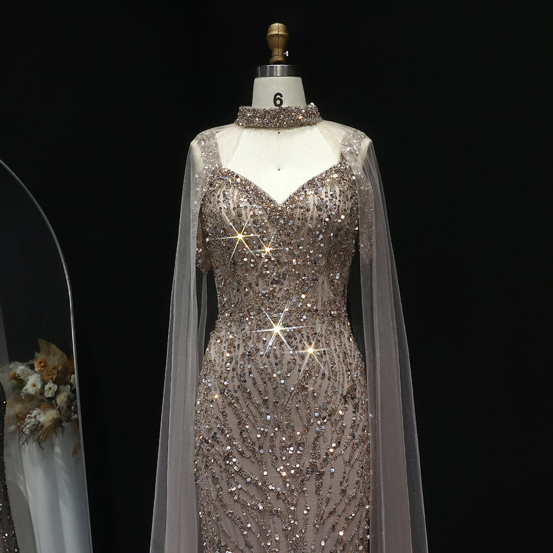Luxury Beaded Champagne Evening Dress with Cape Sleeve SS033