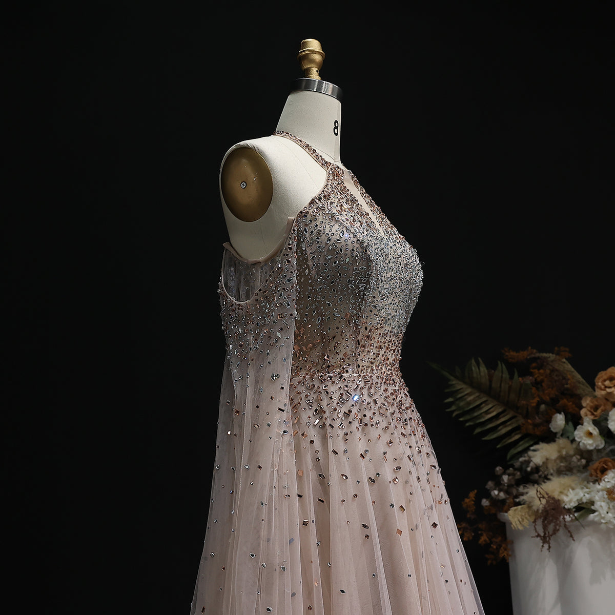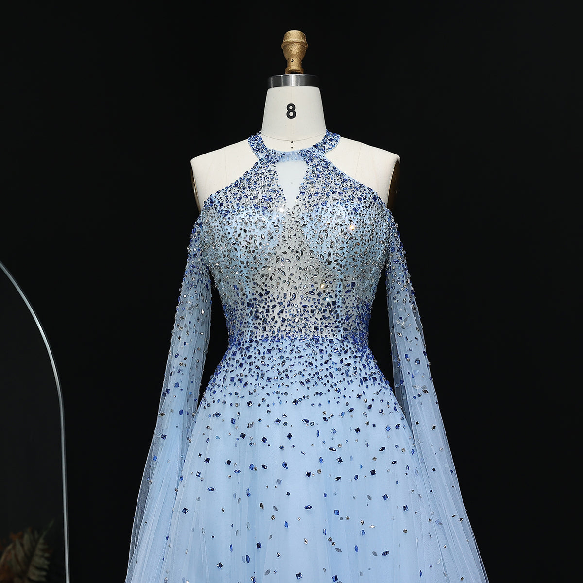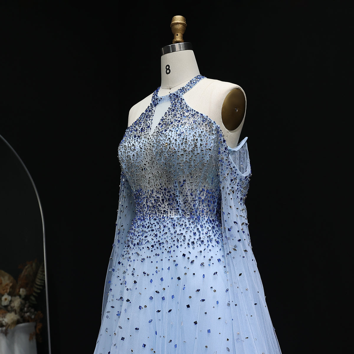 Elegant Crystal Blue Evening Gown with Cape Sleeves SS096