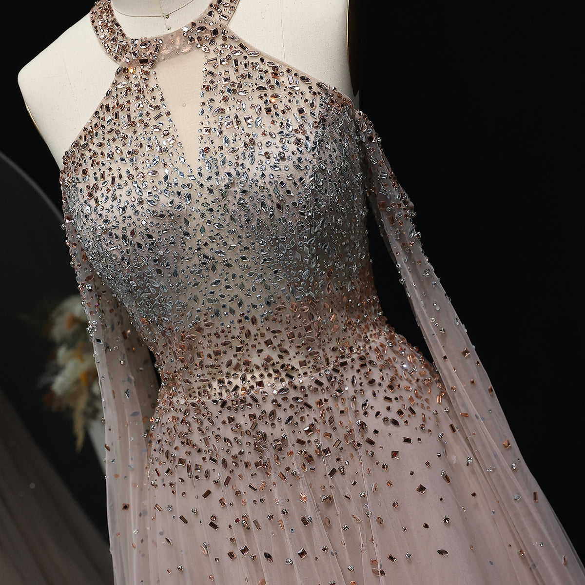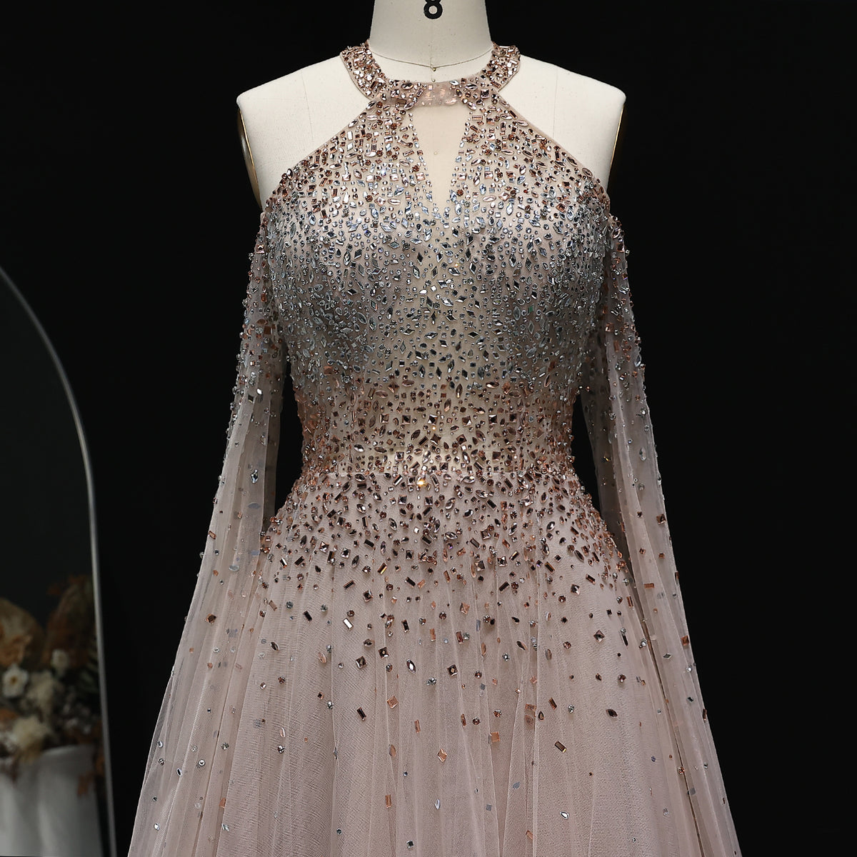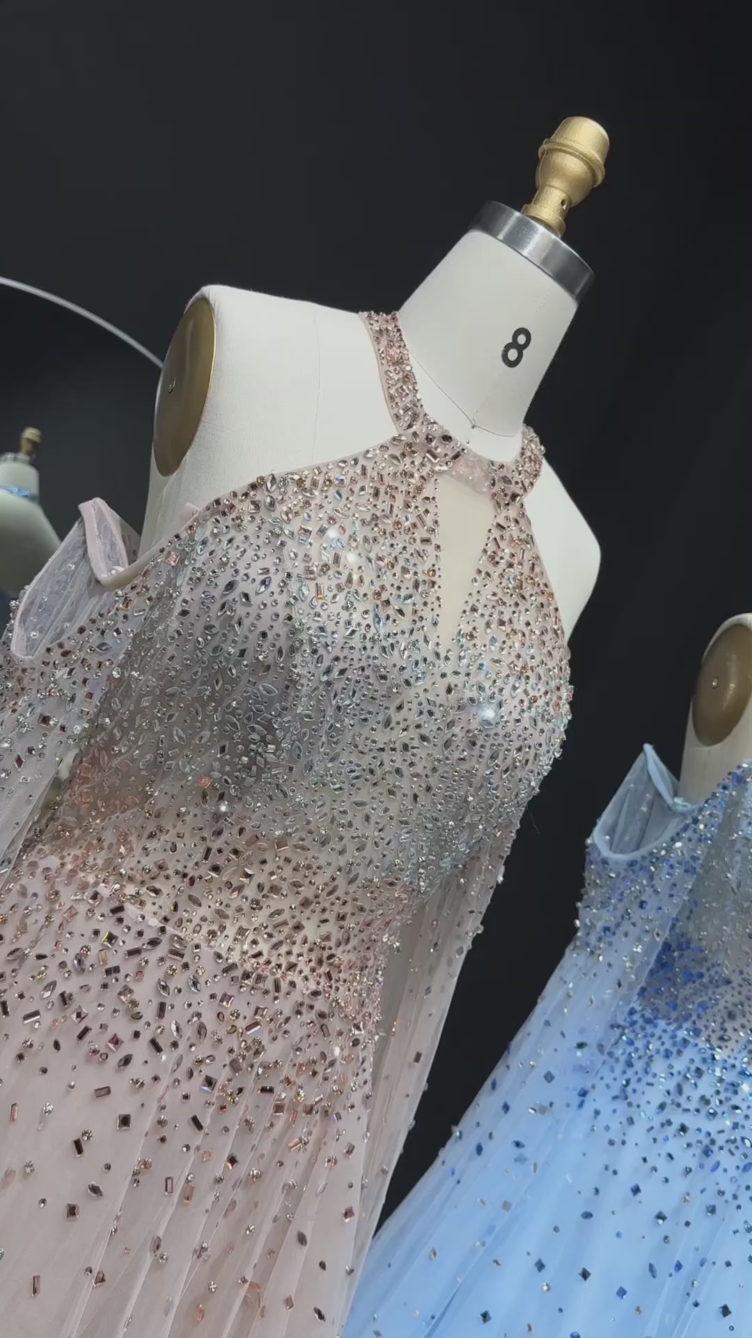 Elegant Crystal Blue Evening Gown with Cape Sleeves SS096