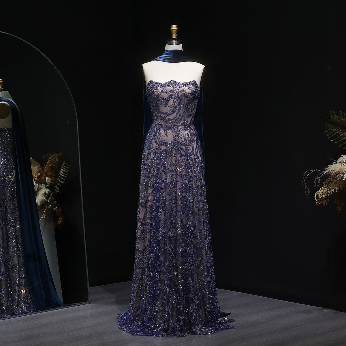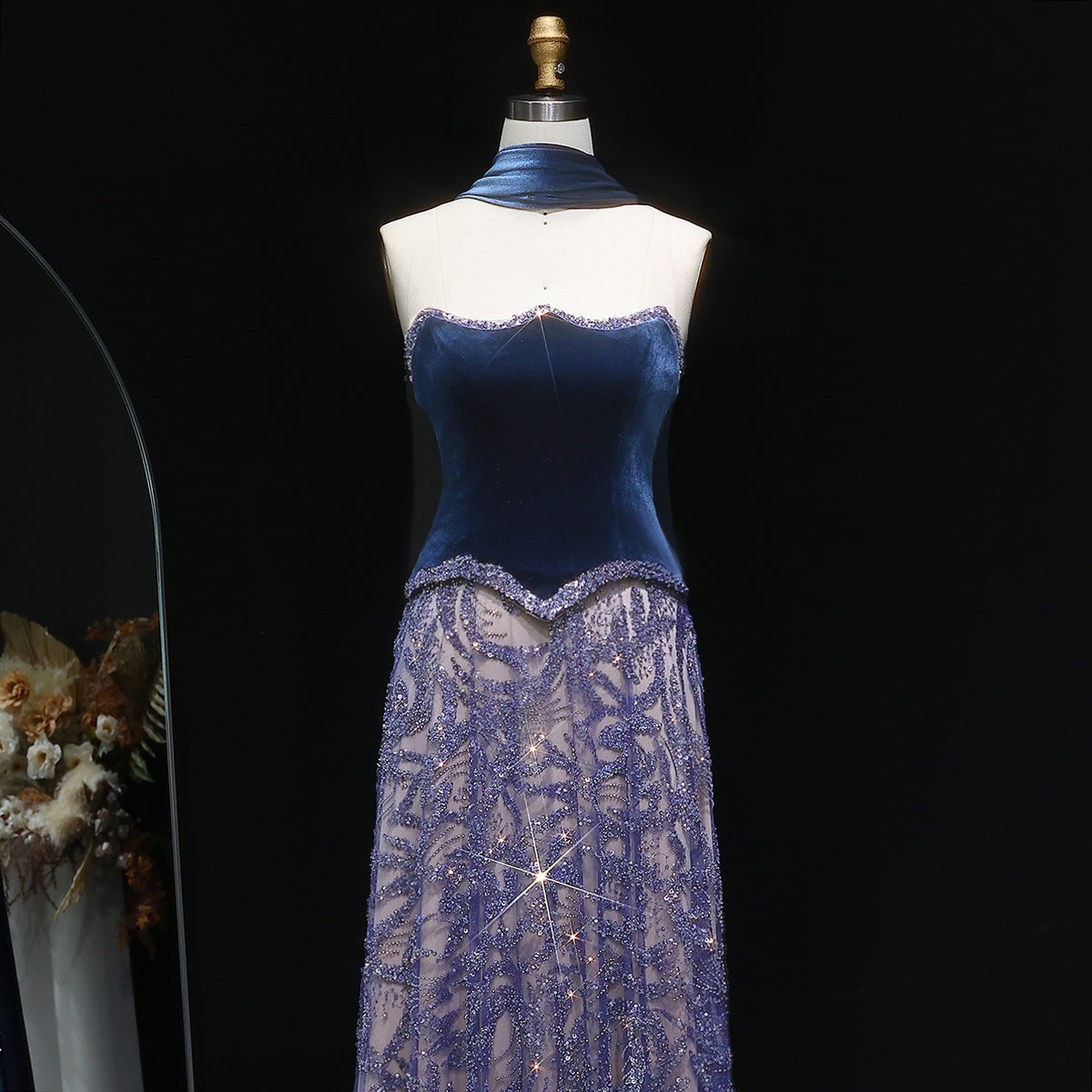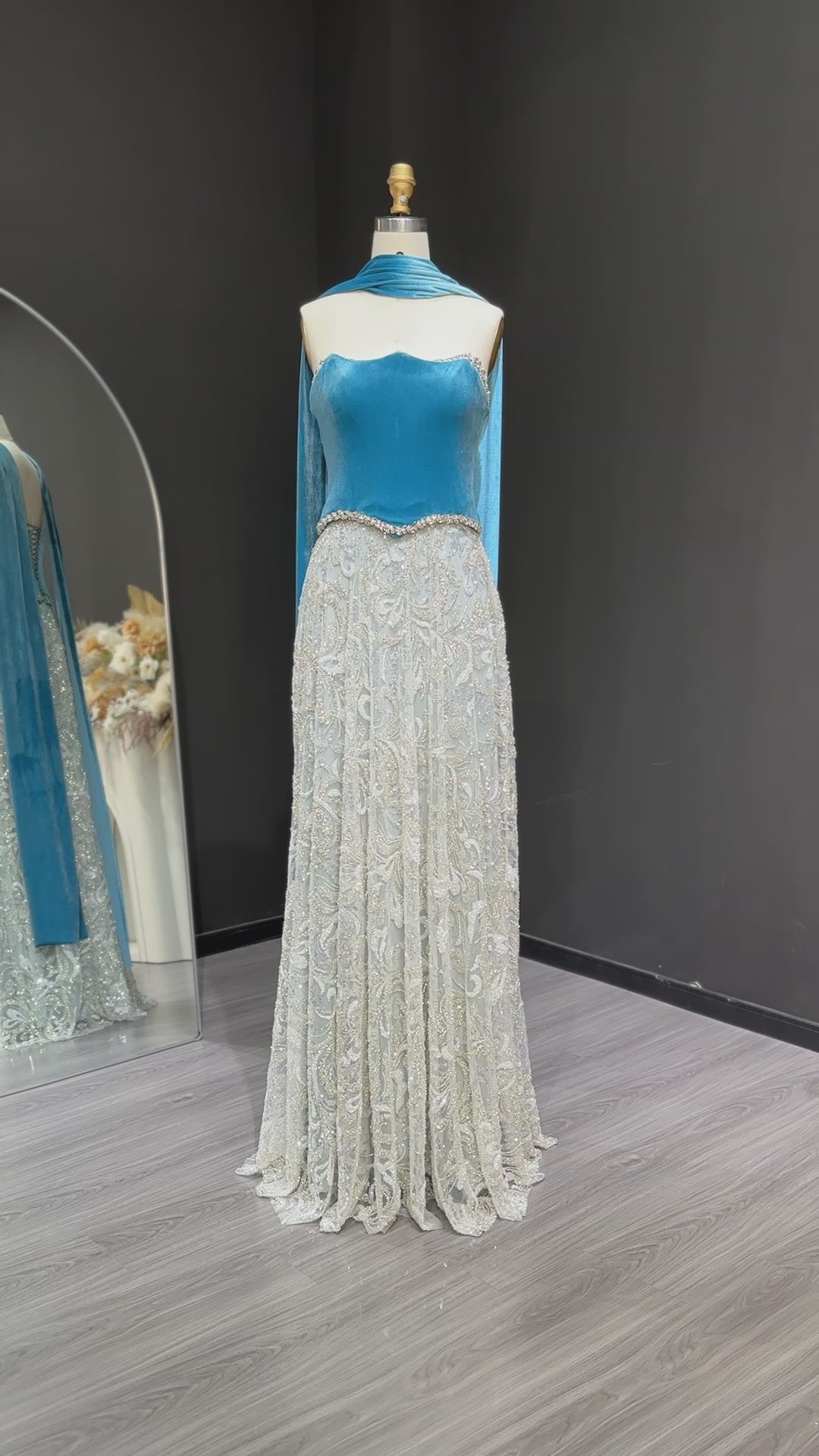 Luxury Beaded Blue Velvet Evening Dress with Scarf SS793