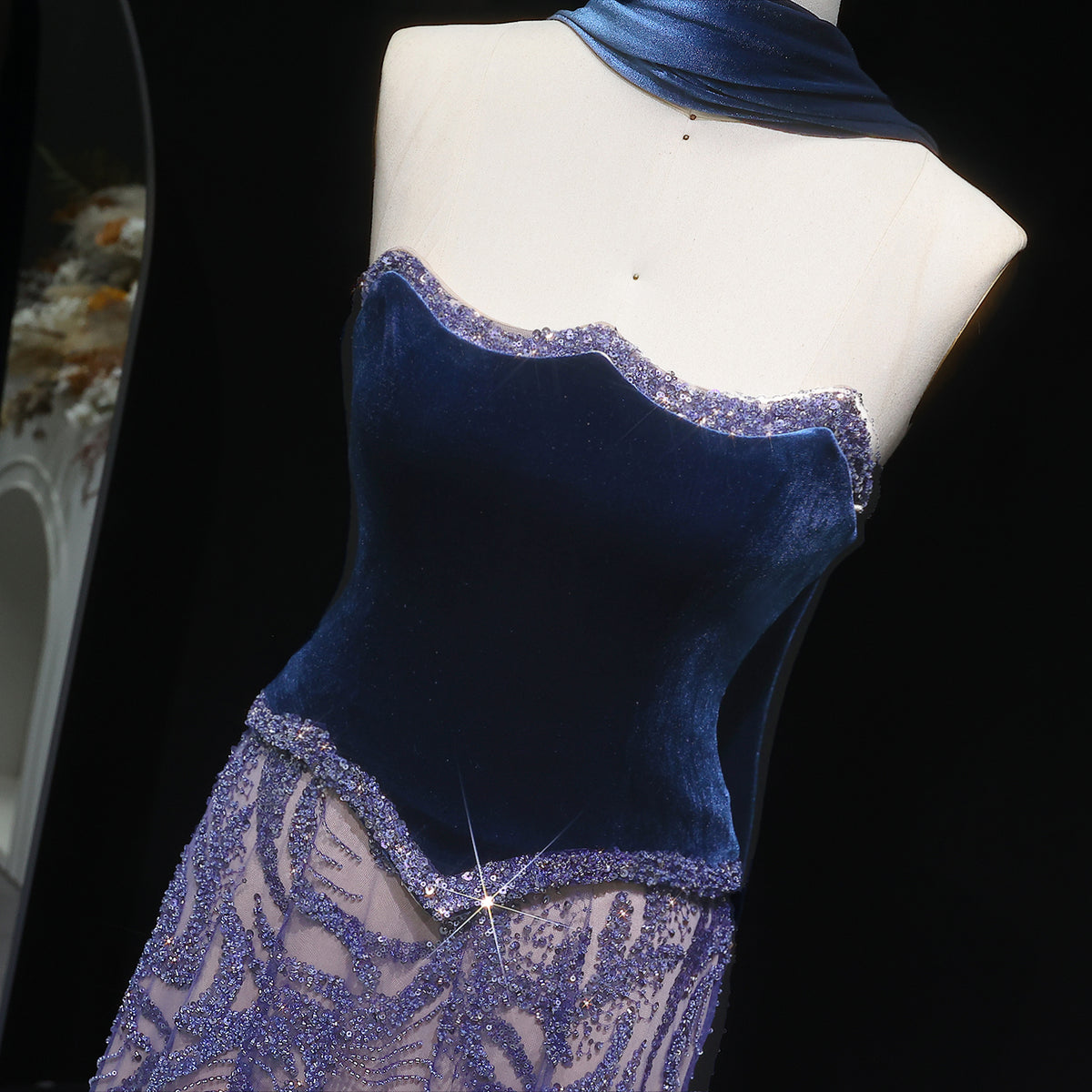 Elevate your evening elegance with this luxury blue velvet dress, exquisitely adorned with delicate beadwork. The rich velvet fabric offers a sumptuous feel and a flattering silhouette, while the matching scarf adds a refined touch of versatility. Perfect for formal occasions, this dress combines timeless sophistication with subtle glamour.
