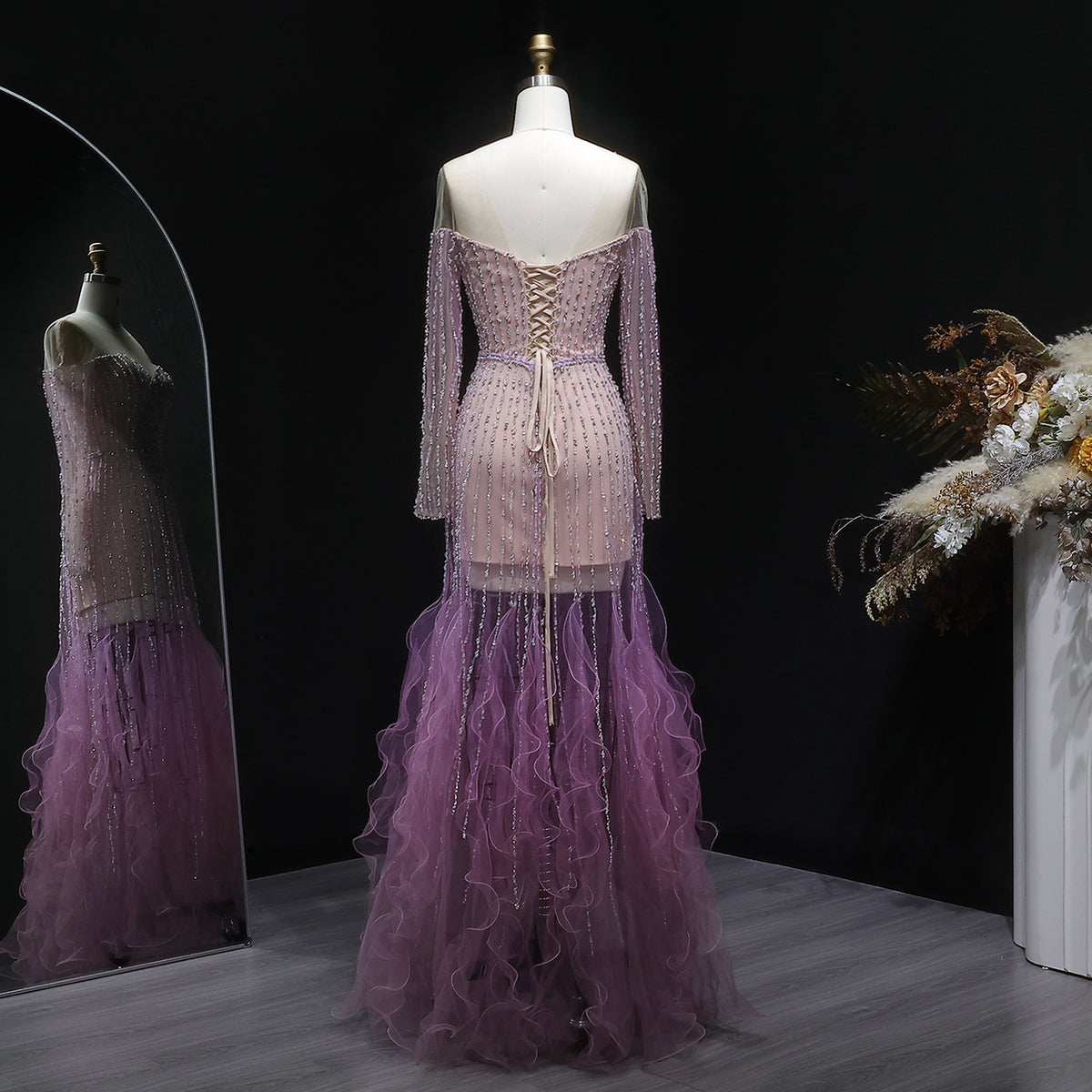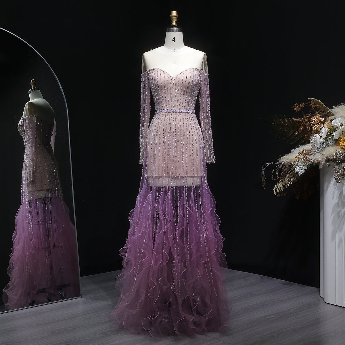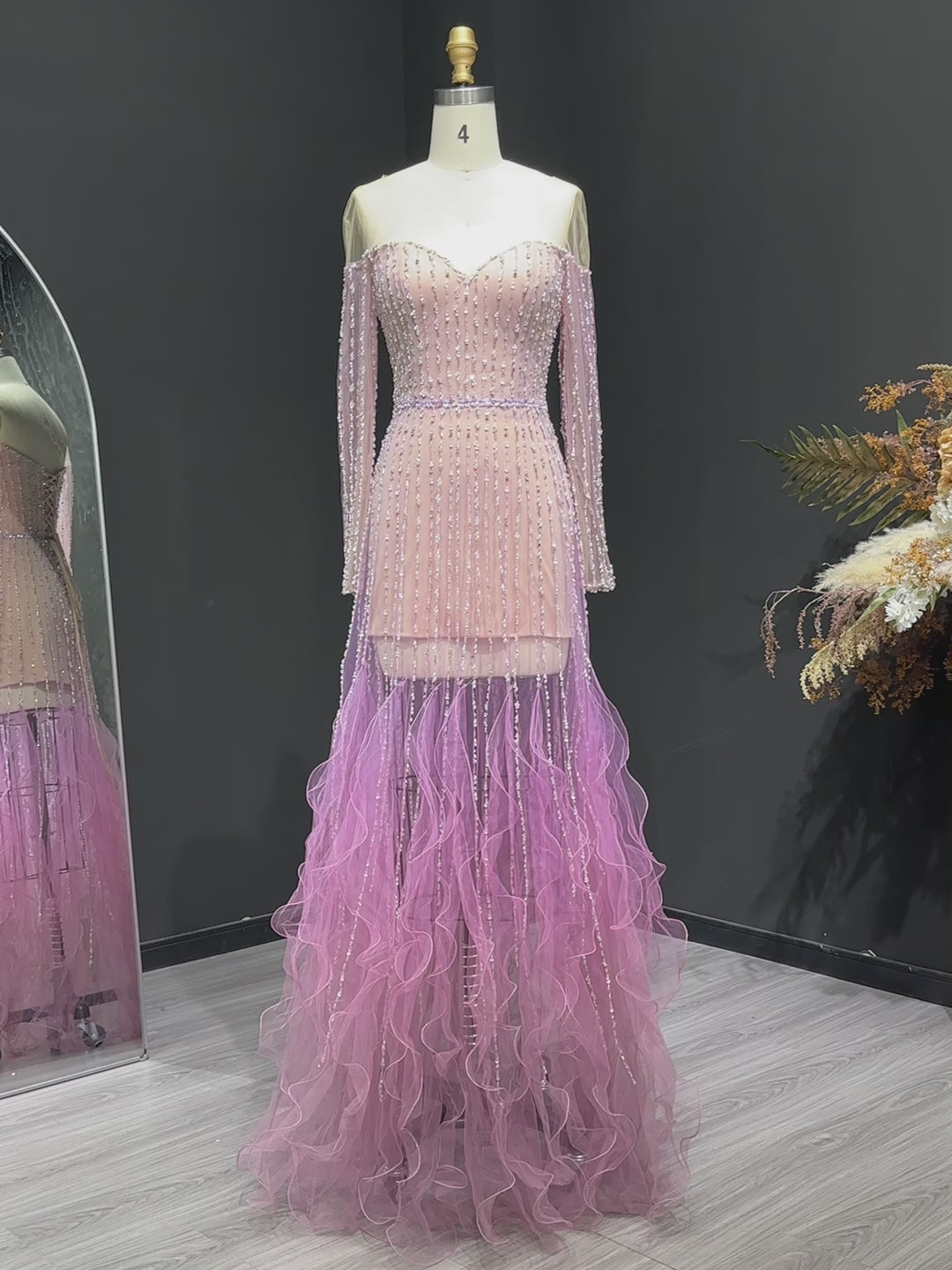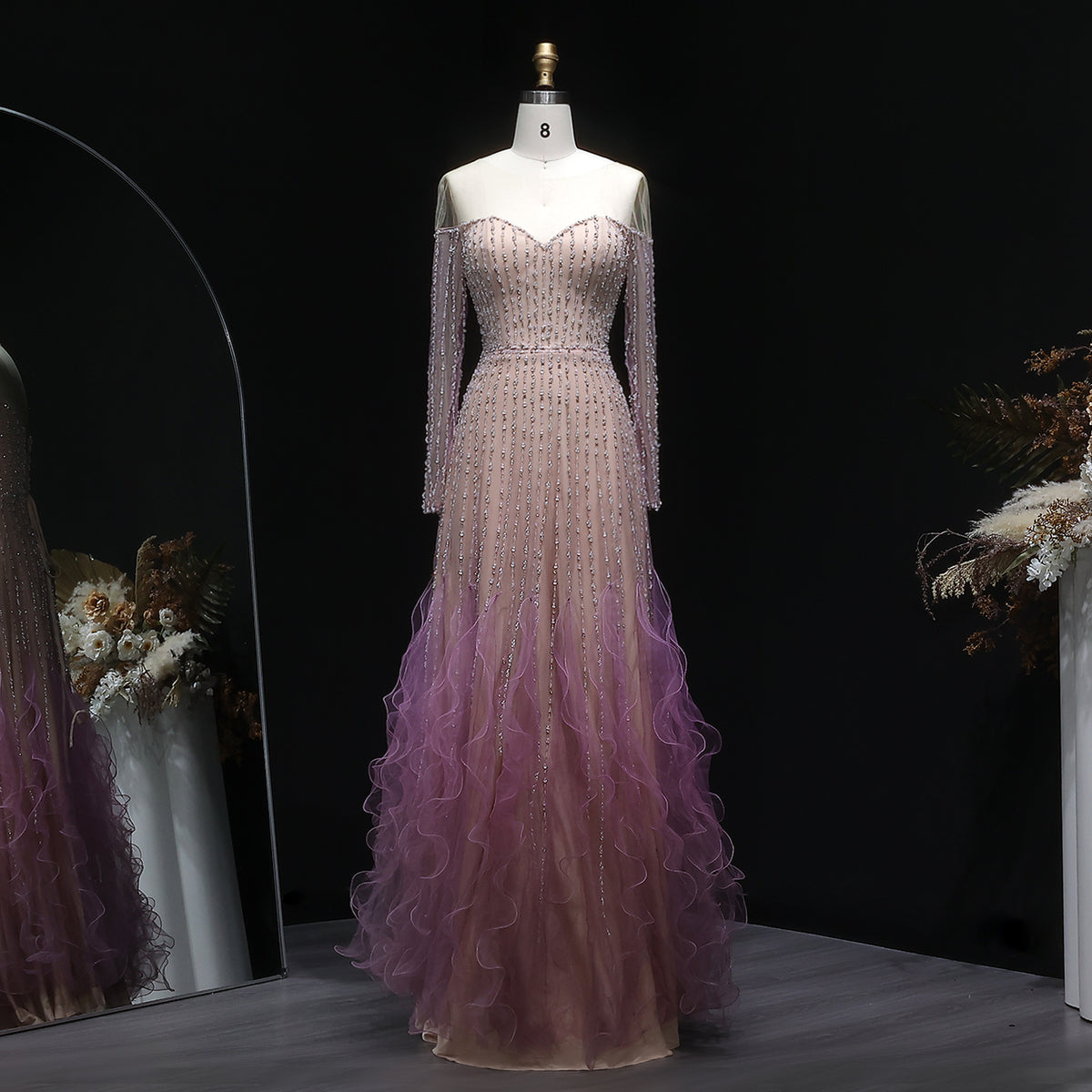Luxury Beaded Gradient Long Sleeve A-Line Evening Dress SS328