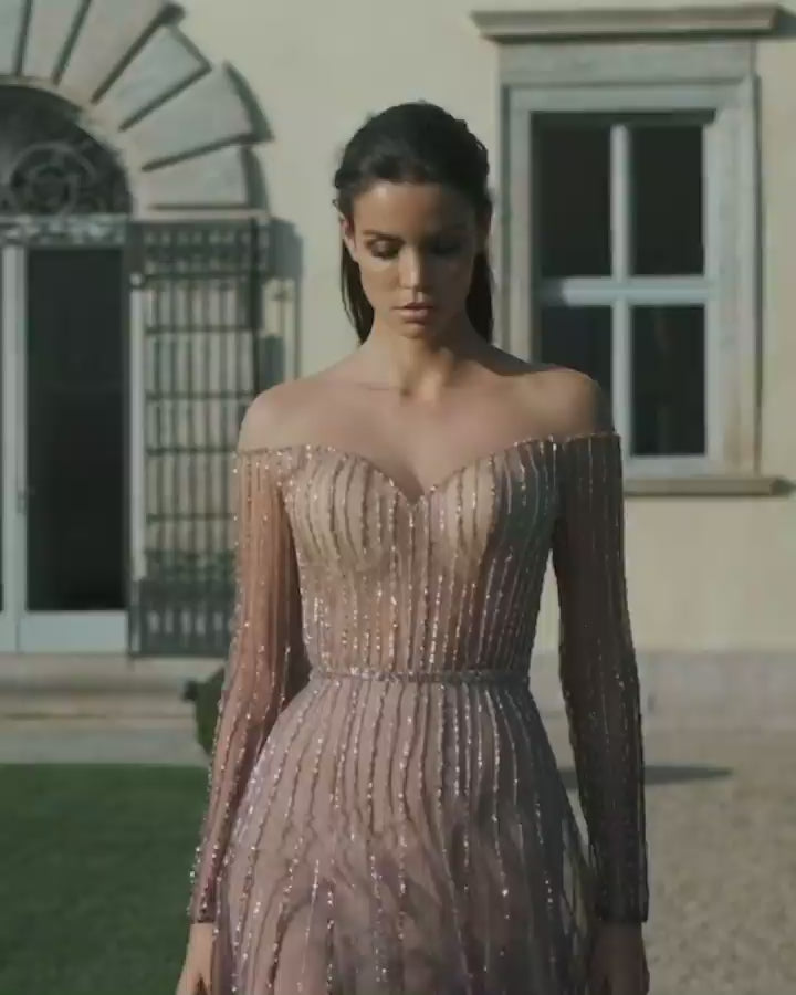 This luxury evening dress, with long sleeves and a gradual beaded gradient, exudes elegance and sophistication. The A-line silhouette is flattering for all body types, making it a versatile choice for any formal event. Experience the high-quality craftsmanship and stunning design of this dress, perfect for making a statement at your next special occasion.