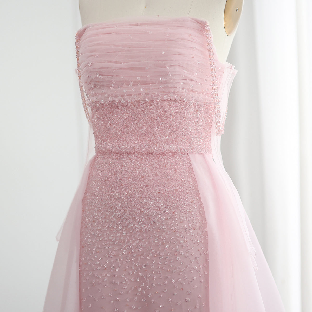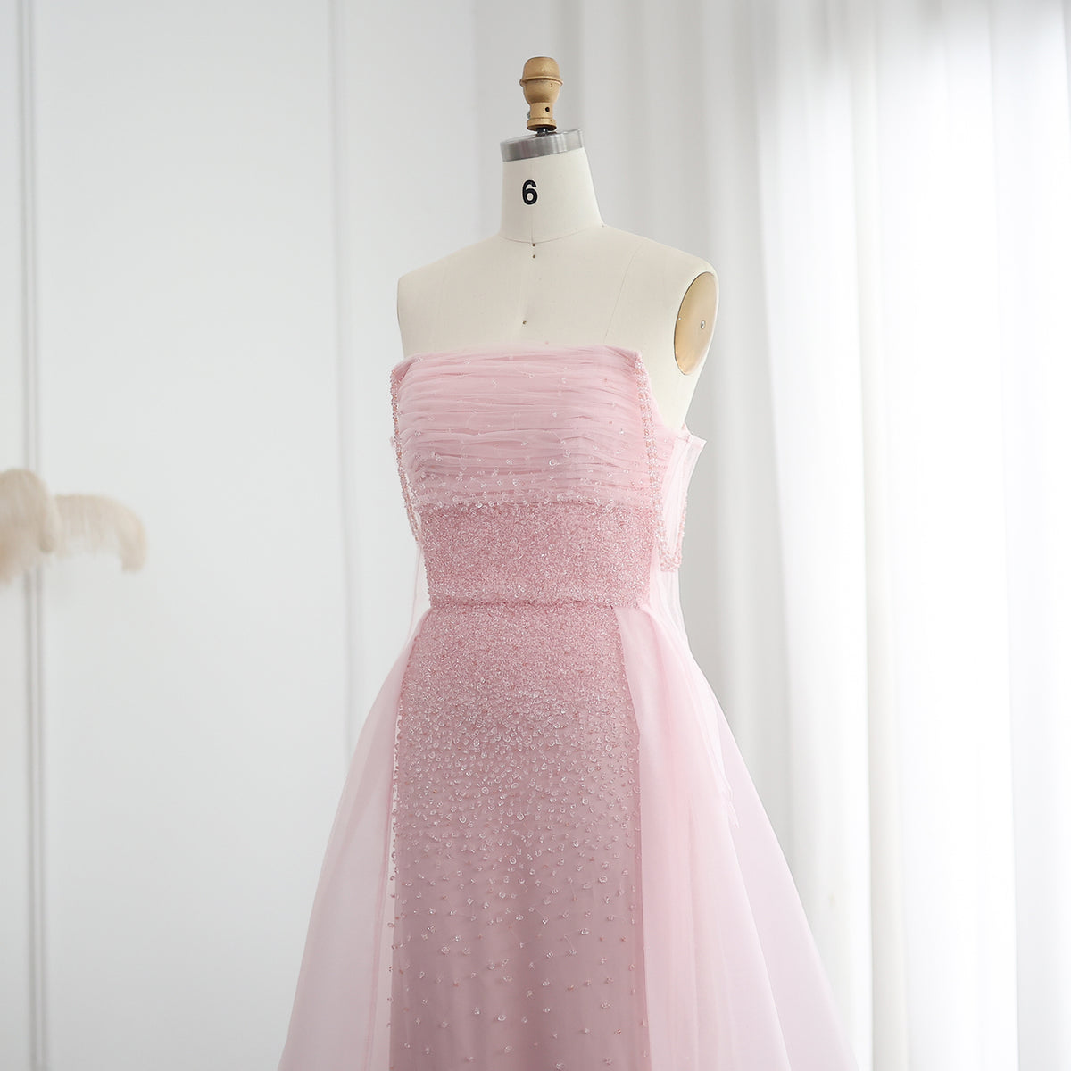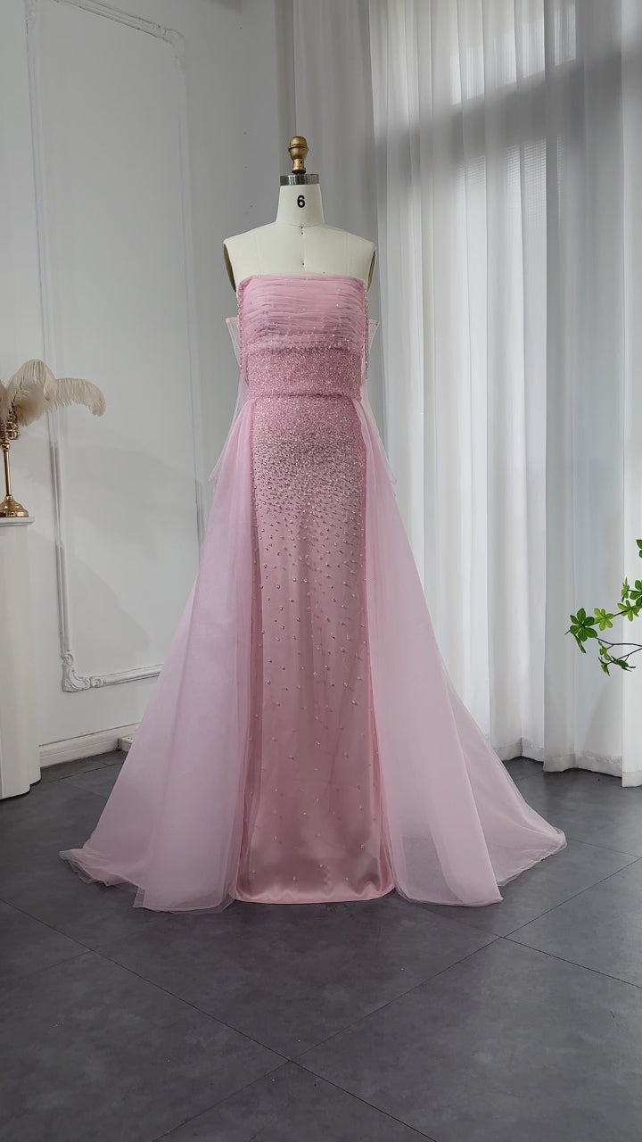 Luxury Beaded Pink Gloves Evening Dress with Overskirt SS429