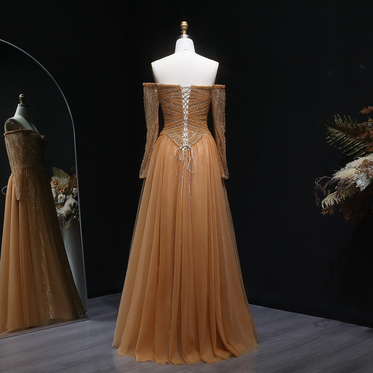 Luxury Champagne Off Shoulder Arabic Evening Dress SS116
