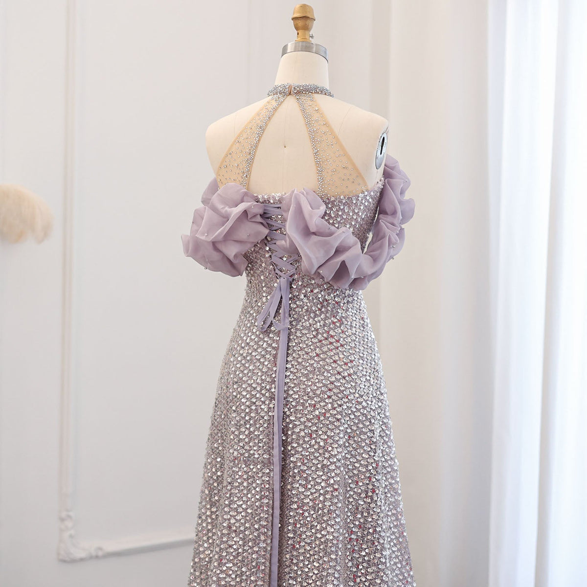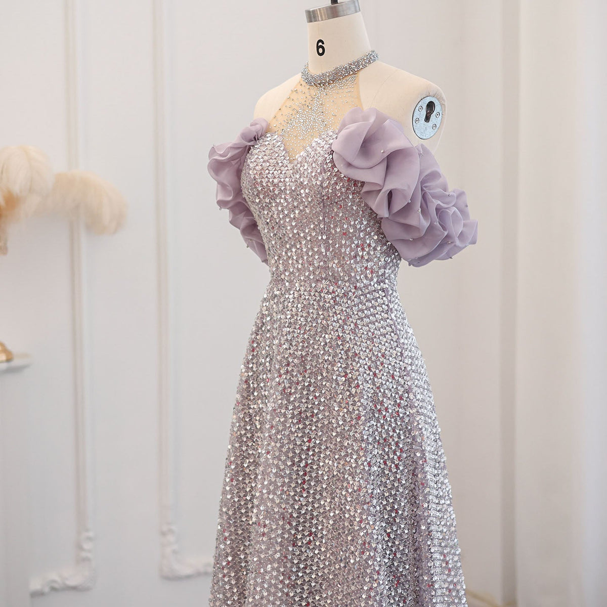 Sparkly Beaded Purple Off Shoulder A-Line Sequin Evening Dress SS715