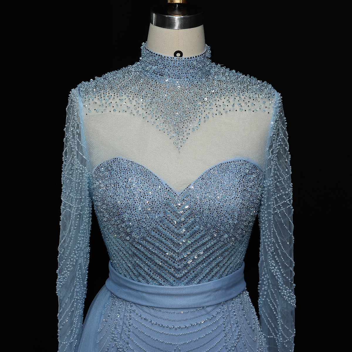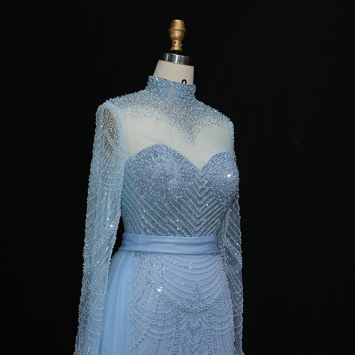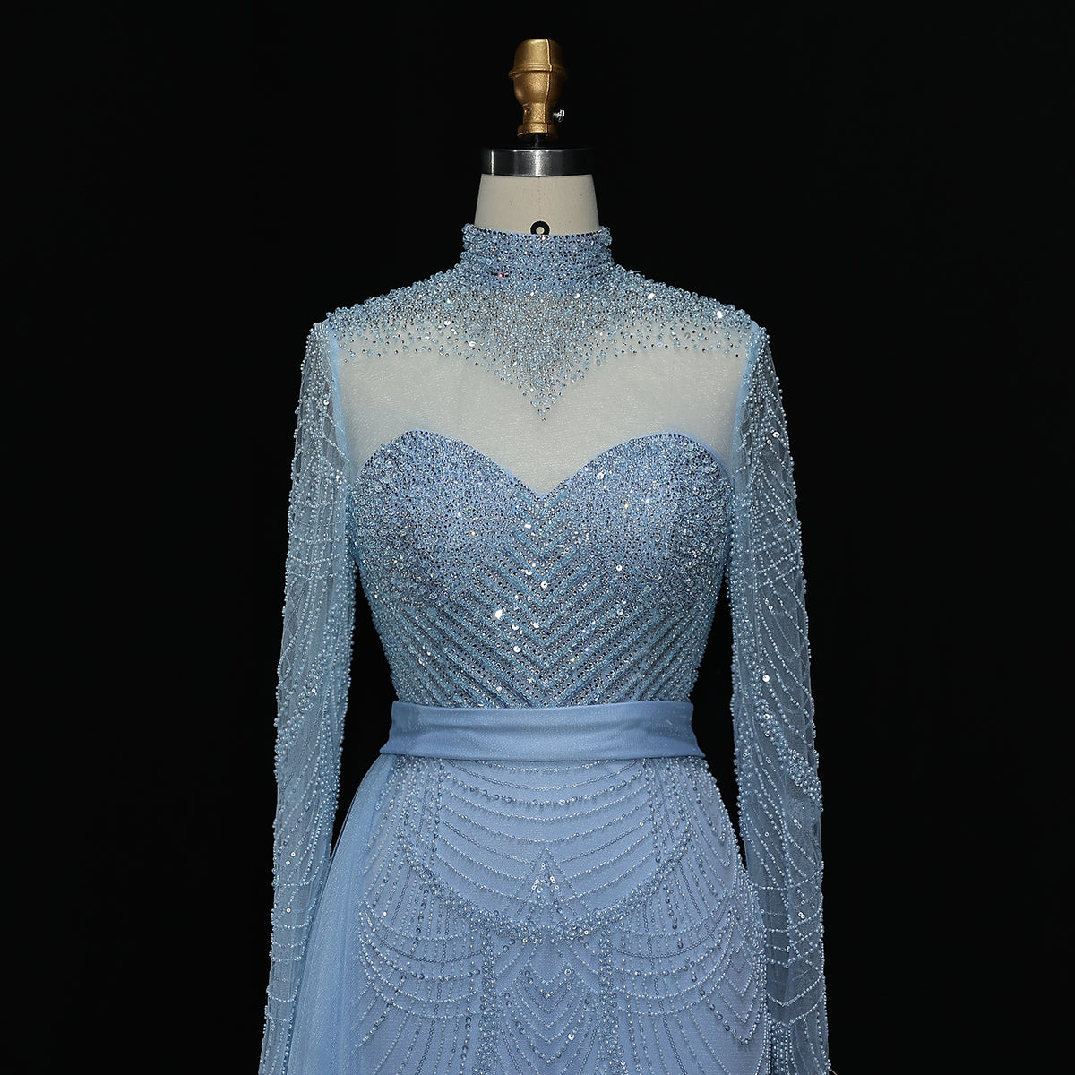 Stunning Beaded Sky Blue Long Sleeves Evening Gown SS015