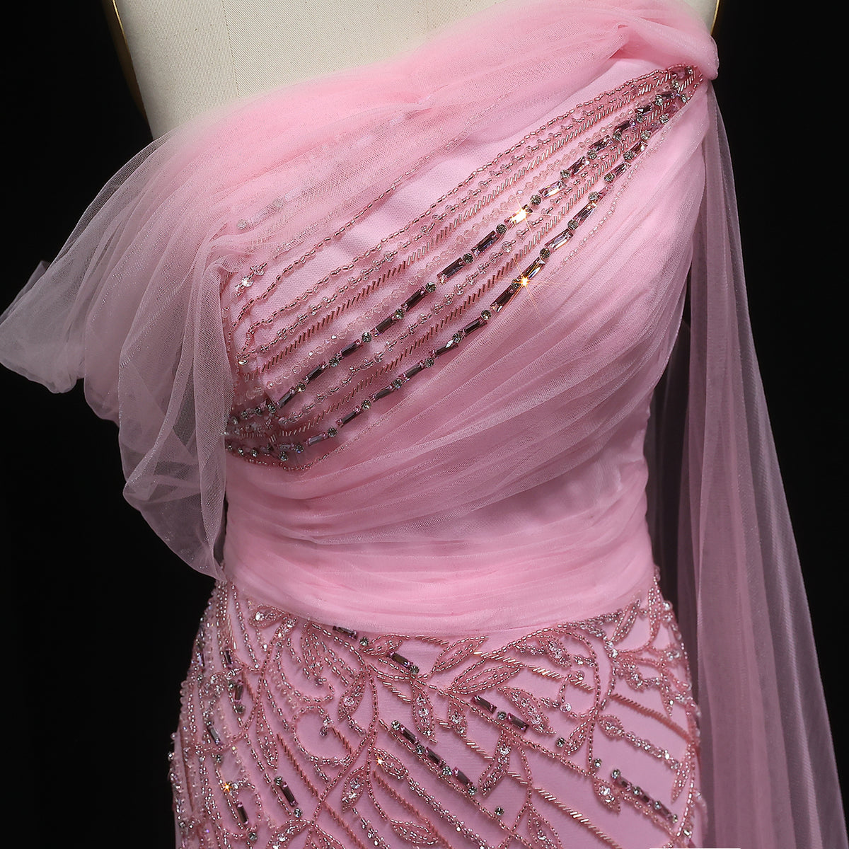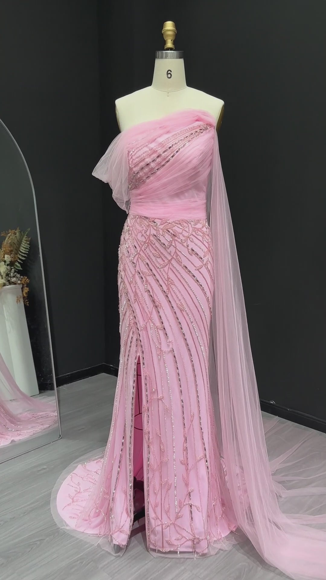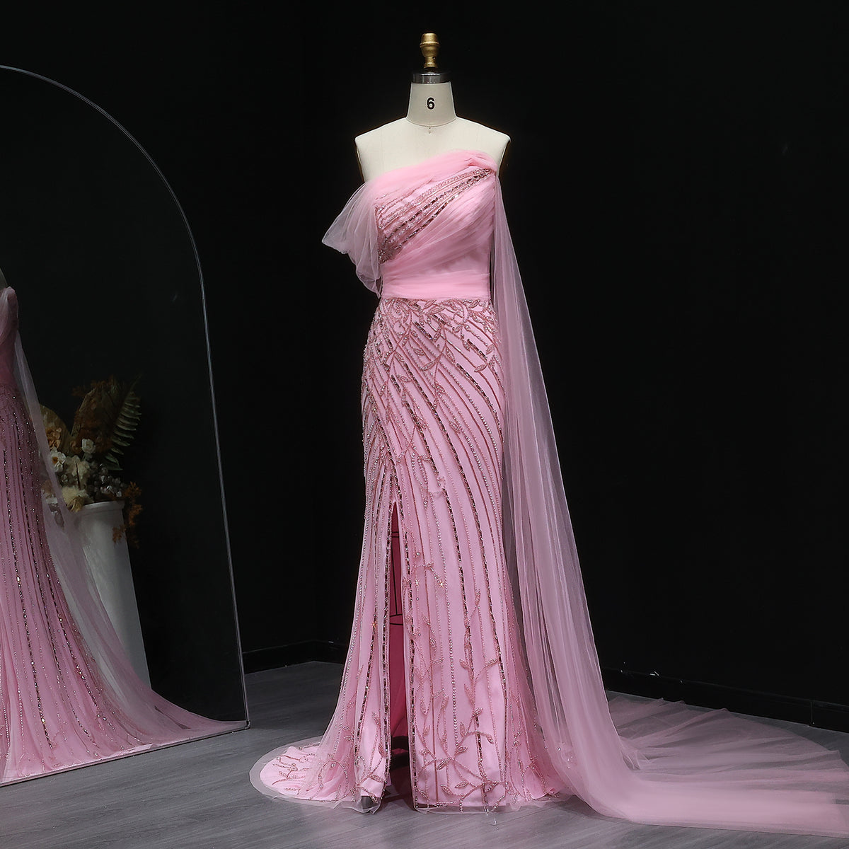 This chic off shoulder blush pink evening gown features elegant cape sleeves, adding a touch of grace to your look. Stand out in style with this sophisticated piece, perfect for any special occasion. Showcase your fashion forward style with this stunning gown.