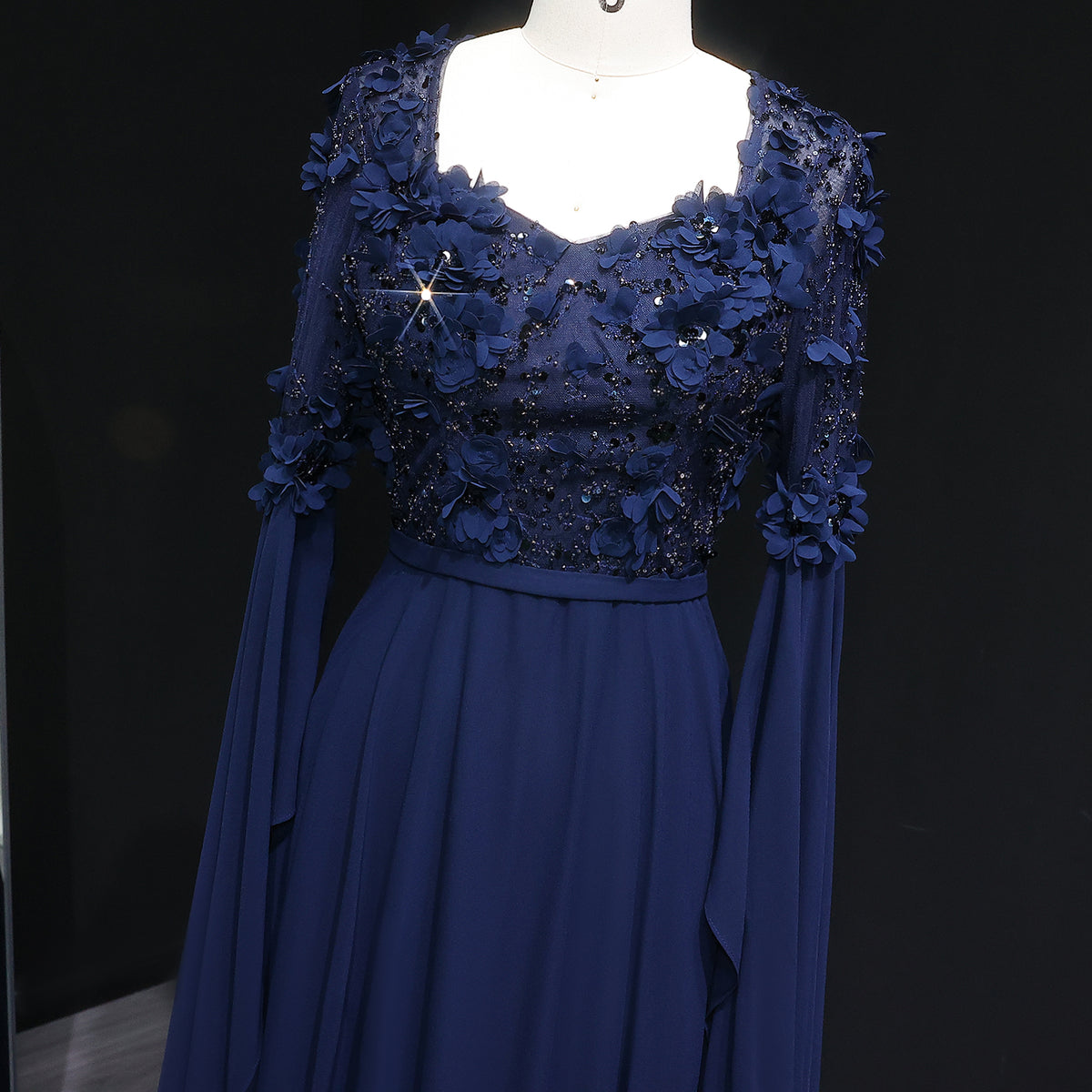 This evening dress showcases exquisite 3D floral appliqués intricately beaded for a stunning textured effect. Designed with graceful cape sleeves, it adds a sophisticated silhouette that flows elegantly. Perfect for formal occasions, this dress combines artistry and refined tailoring to ensure a memorable and polished appearance.