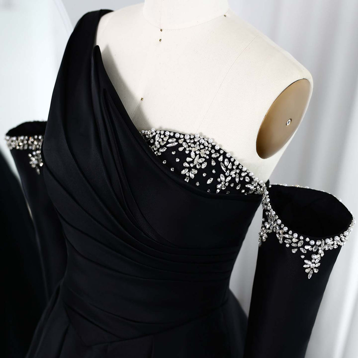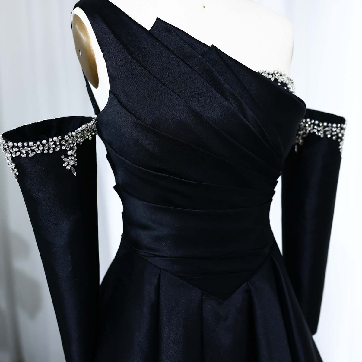 This stunning black satin dress is the epitome of elegance and style. With a crystal-embellished one shoulder design, it exudes luxury and sophistication. Perfect for any evening occasion, it will make you feel confident and beautiful. Elevate your wardrobe with this timeless piece.