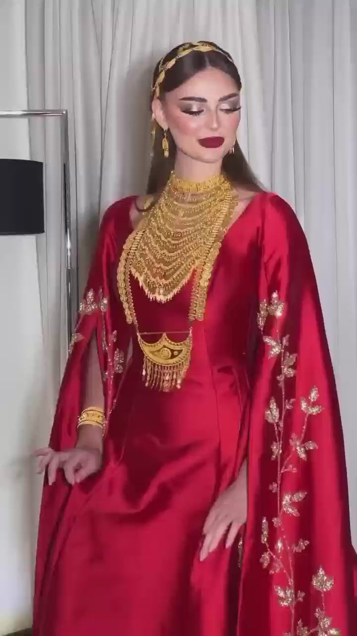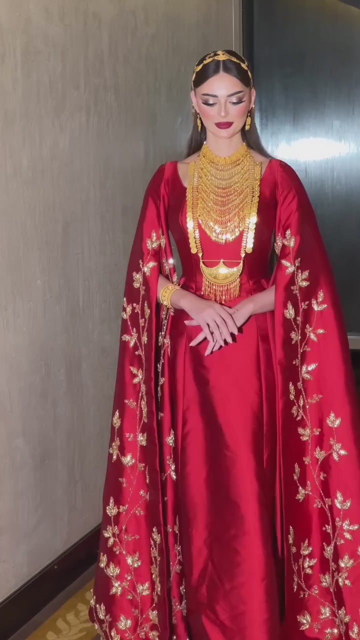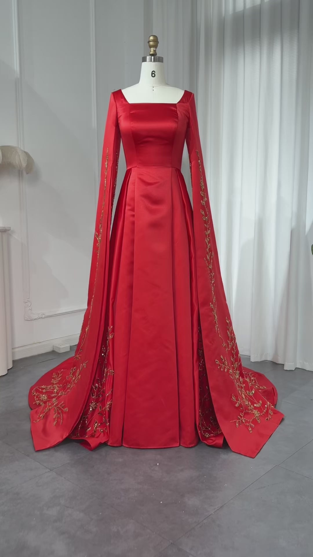 Elegant Floral Embroidery Red Evening Dress with Cape Sleeve SS568