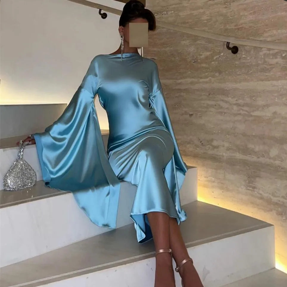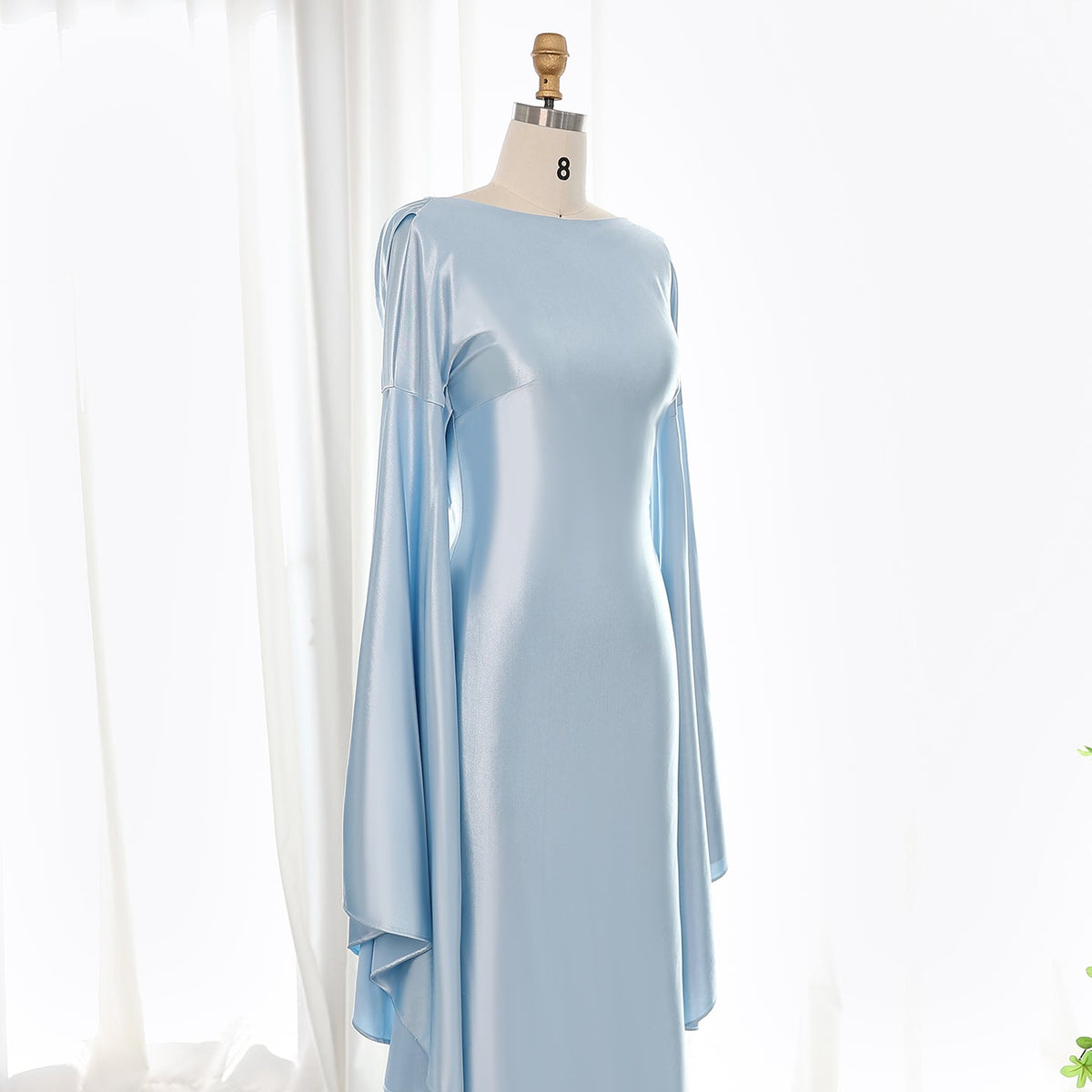 Elegant Light Blue Mermaid Evening Dress with Flare Long Sleeves SF027