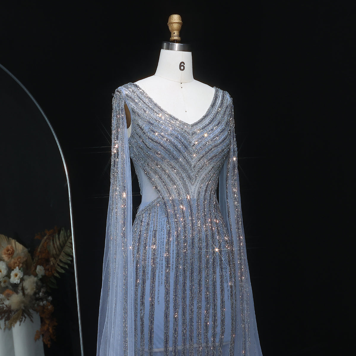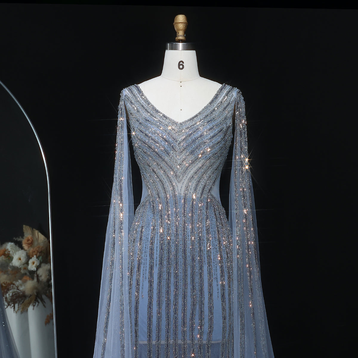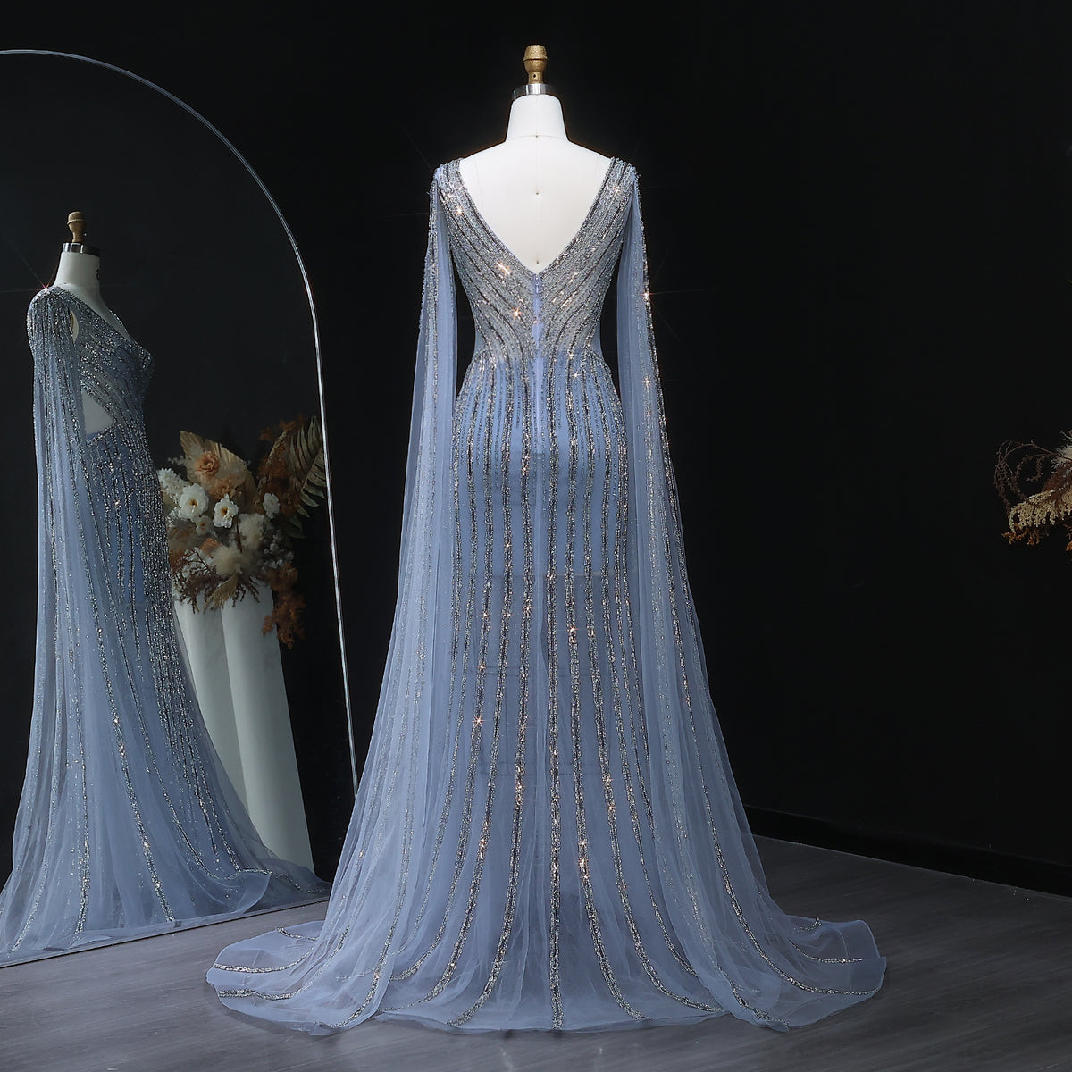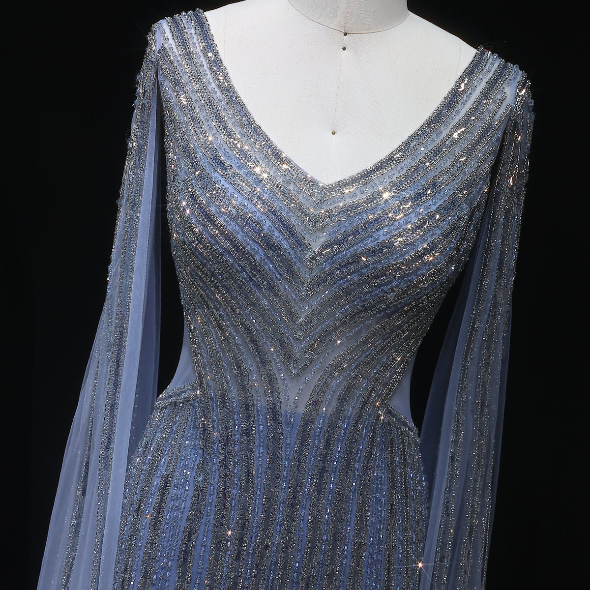 Luxury Beaded Blue V-Neck Mermaid Evening Dress with Cape Sleeves SS251