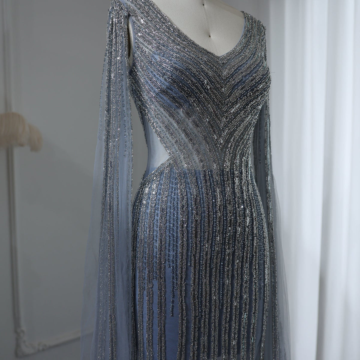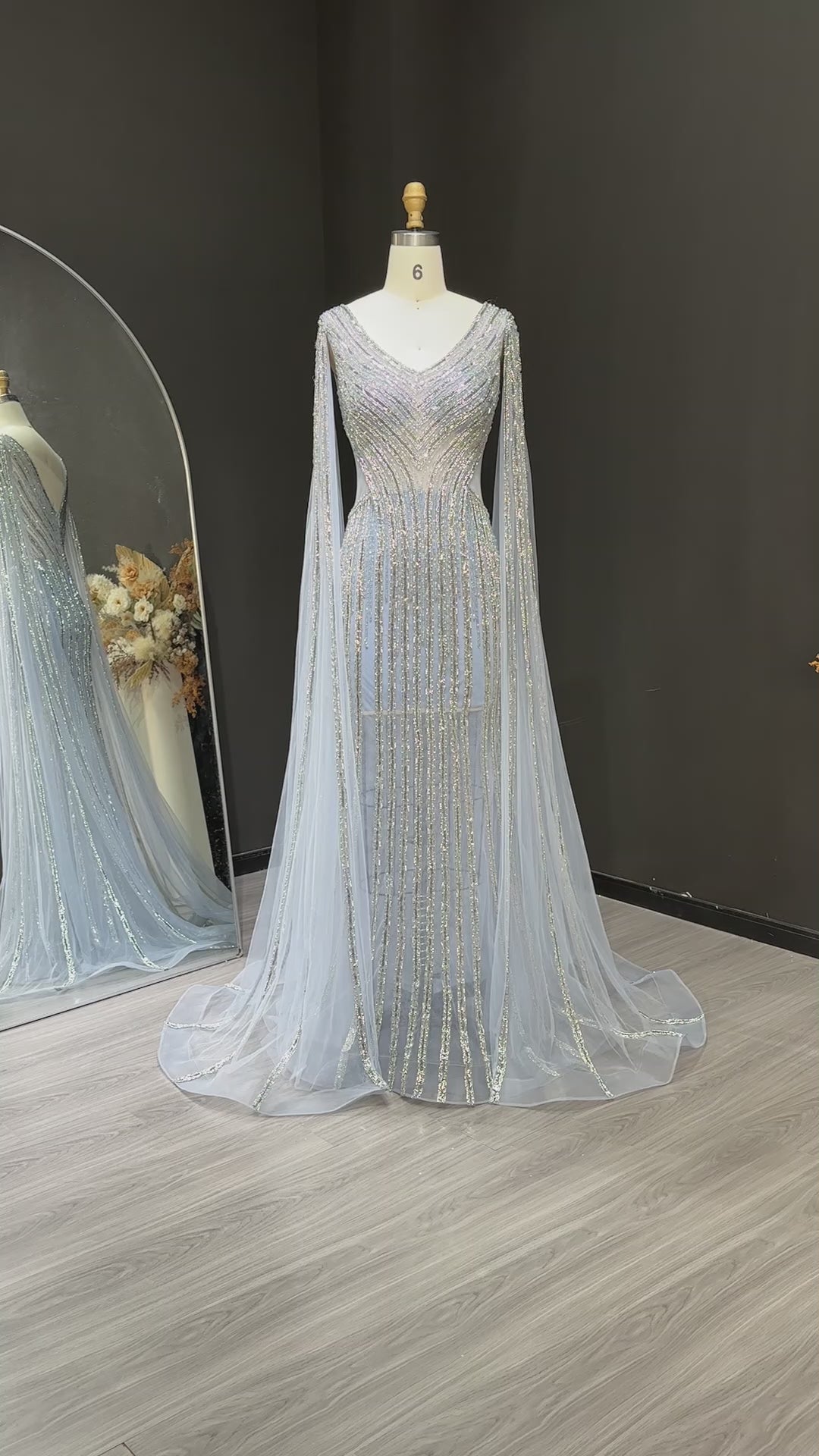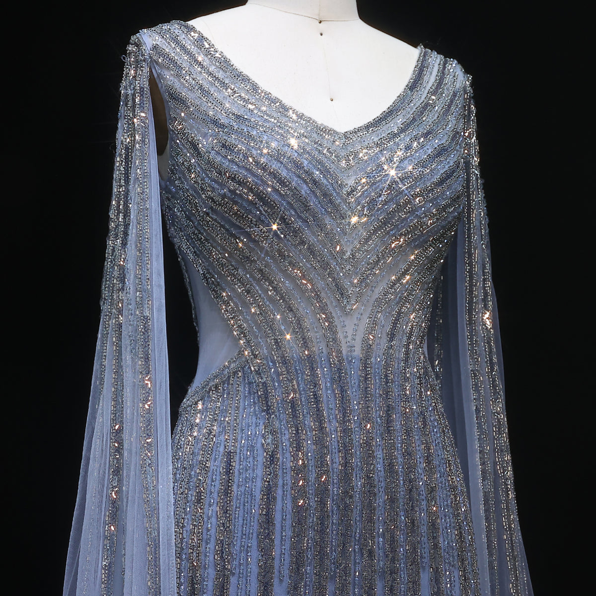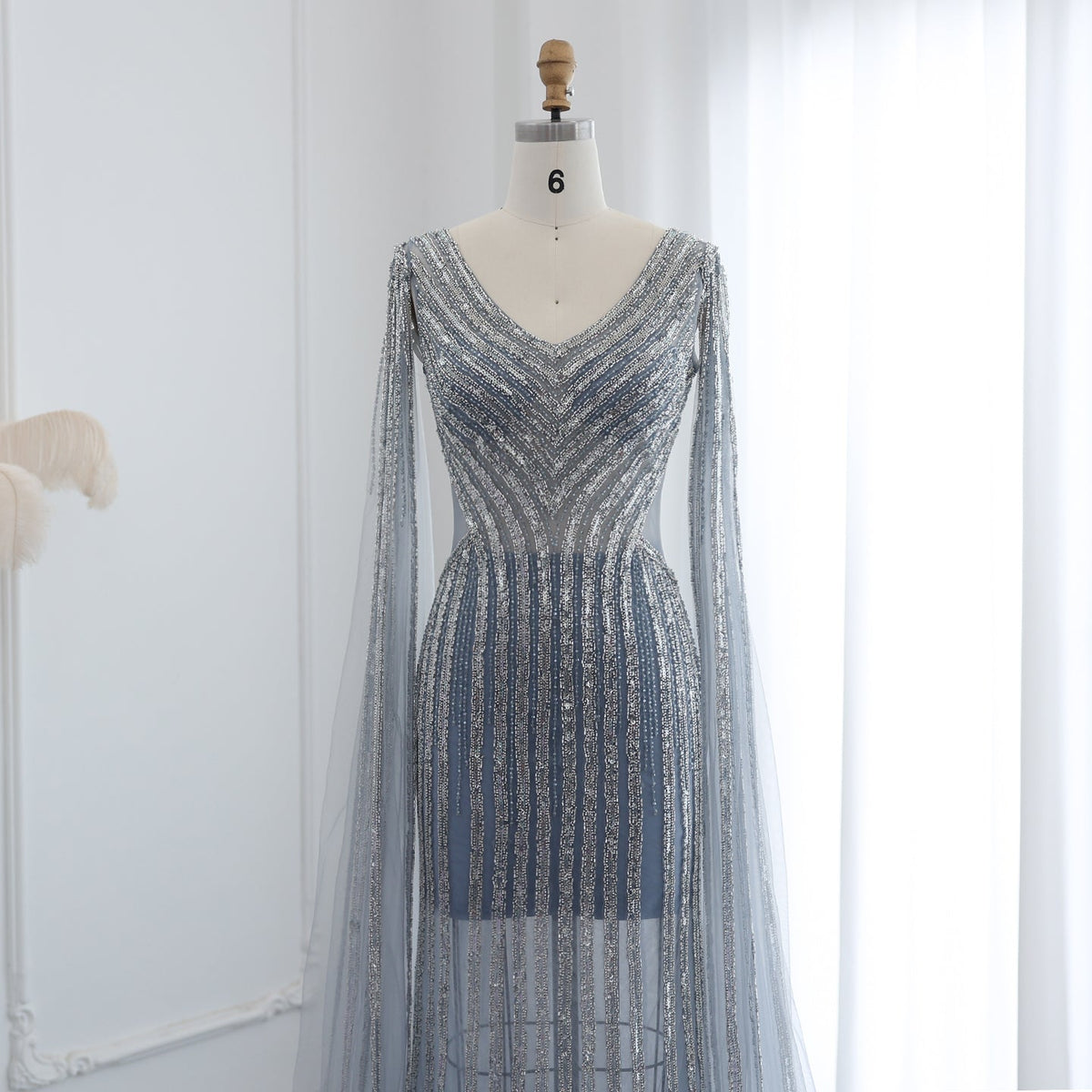Luxury Beaded Blue V-Neck Mermaid Evening Dress with Cape Sleeves SS251