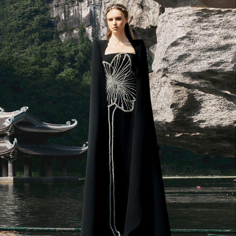 Elegant Beaded Black Long Evening Dress with Cape Sleeves SS275