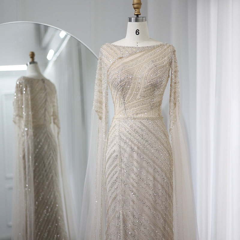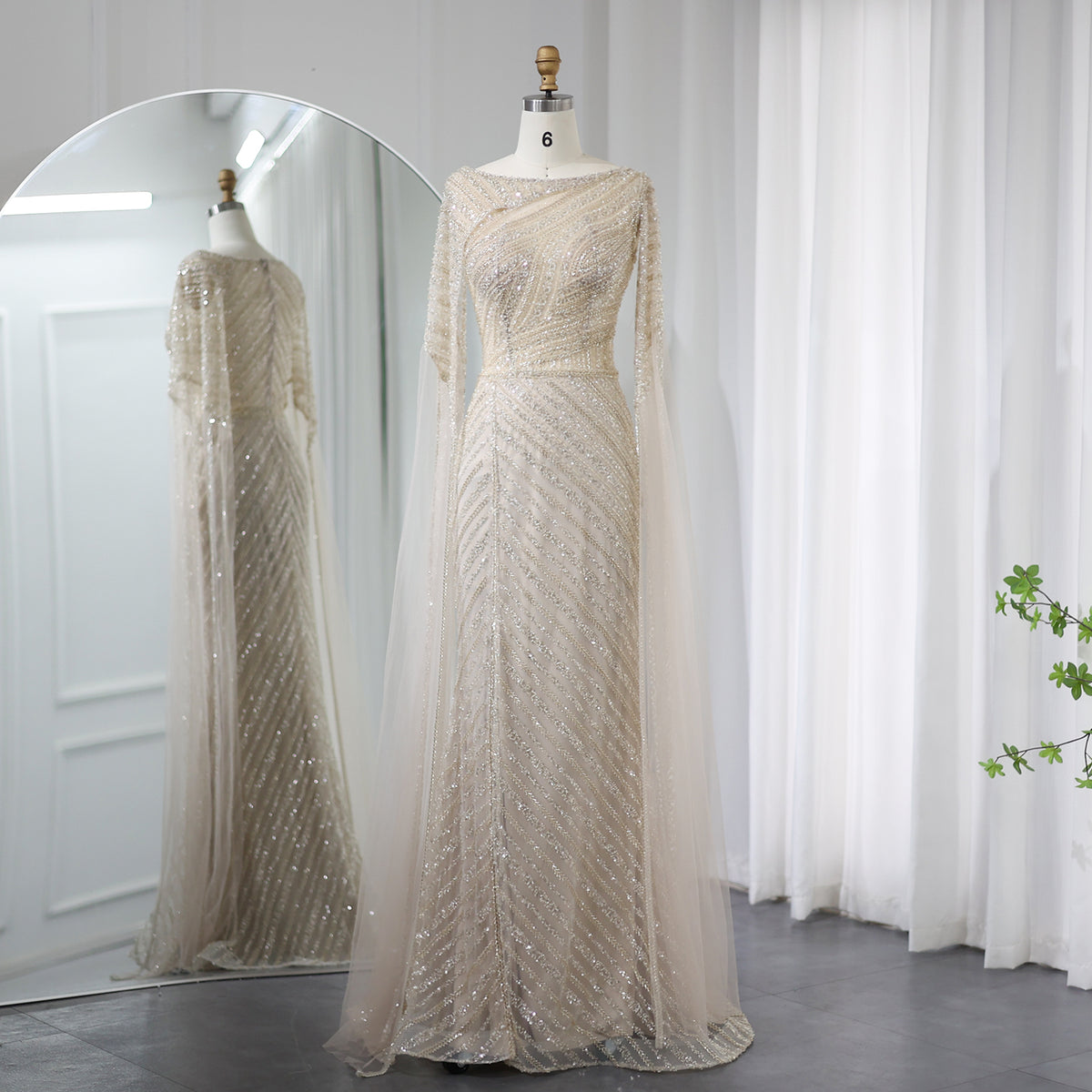 Luxury Beaded Champagne Evening Dress with Cape SS590