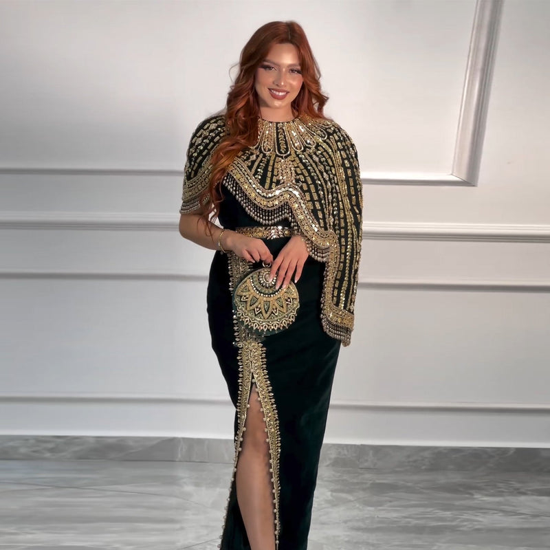 Luxury Embroider Pearls Black Evening Dress with Cape Sleeves SS487