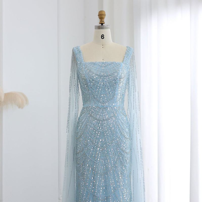 Luxury Beaded Blue Mermaid Evening Dress with Cape Sleeves SS690