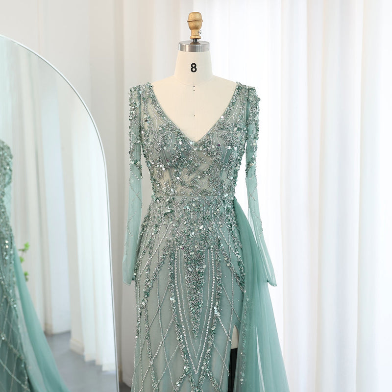 Luxury Crystal Sage Green V-Neck Evening Dresses with Cape SS399