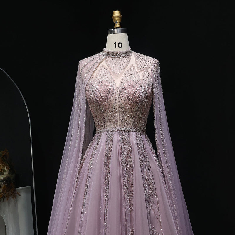 Luxurious Crystal Pearls Evening Dress with Cape Sleeves SS750