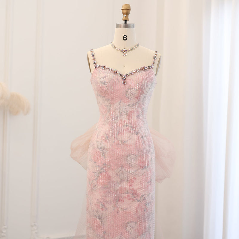 Elegant Crystal Pink Velvet Mermaid Bow Evening Dress SS716